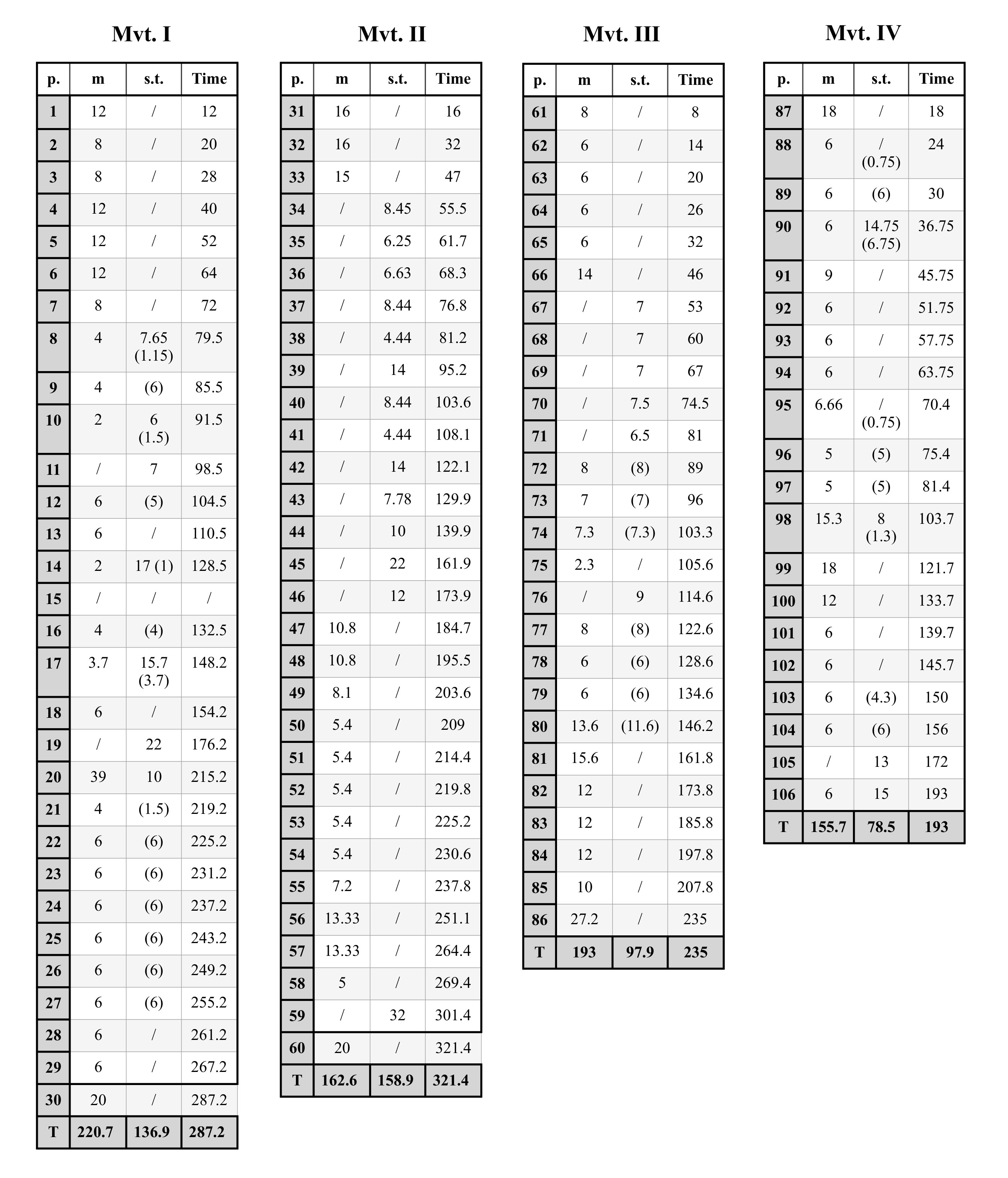 Example 7. Duration of metronomic (m.) and senza tempo strata (s.t.) and cumulative time in seconds for each movement. Each line indicates a page of the Chamber Concerto (Edition Schott). Times in brackets in the senza tempo stratum correspond to times simultaneous with the metronomic stratum.