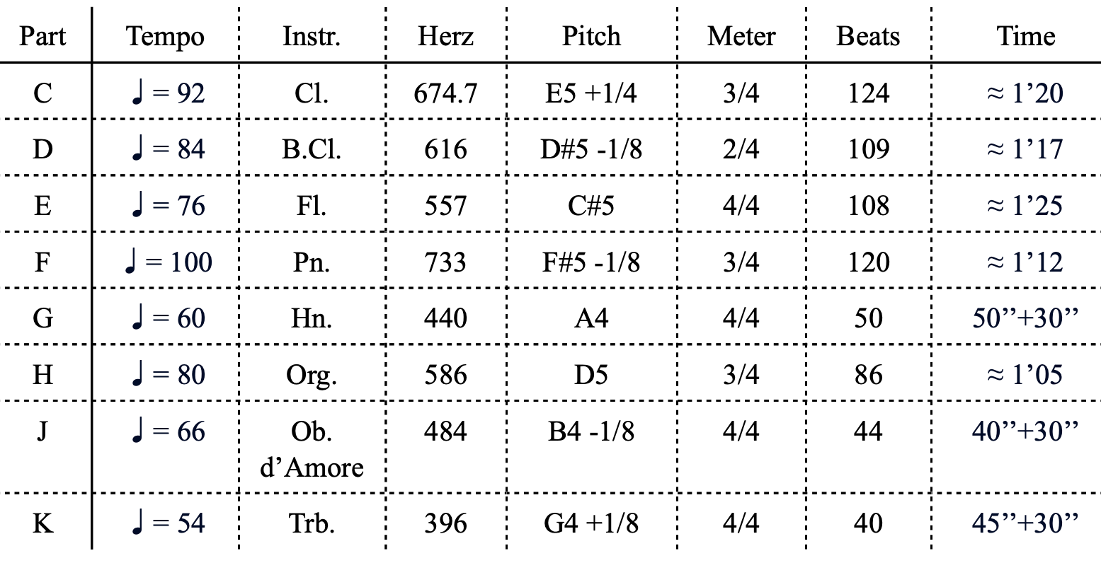 Table of tempo-pitches “mediation” for the second movement, letters C–K