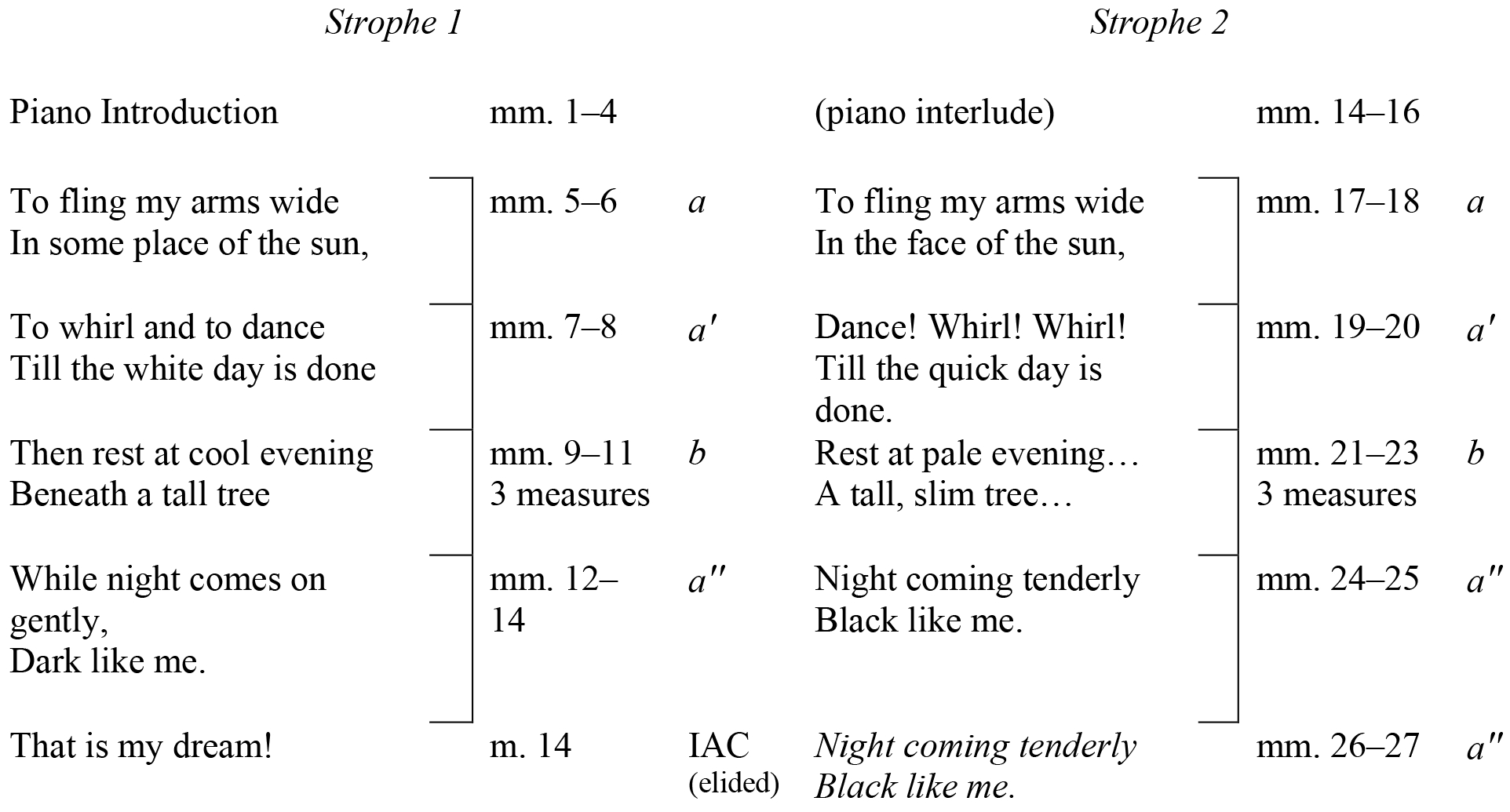 Margaret Bonds, “Dream Variation” (1959), text with form and phrase layout