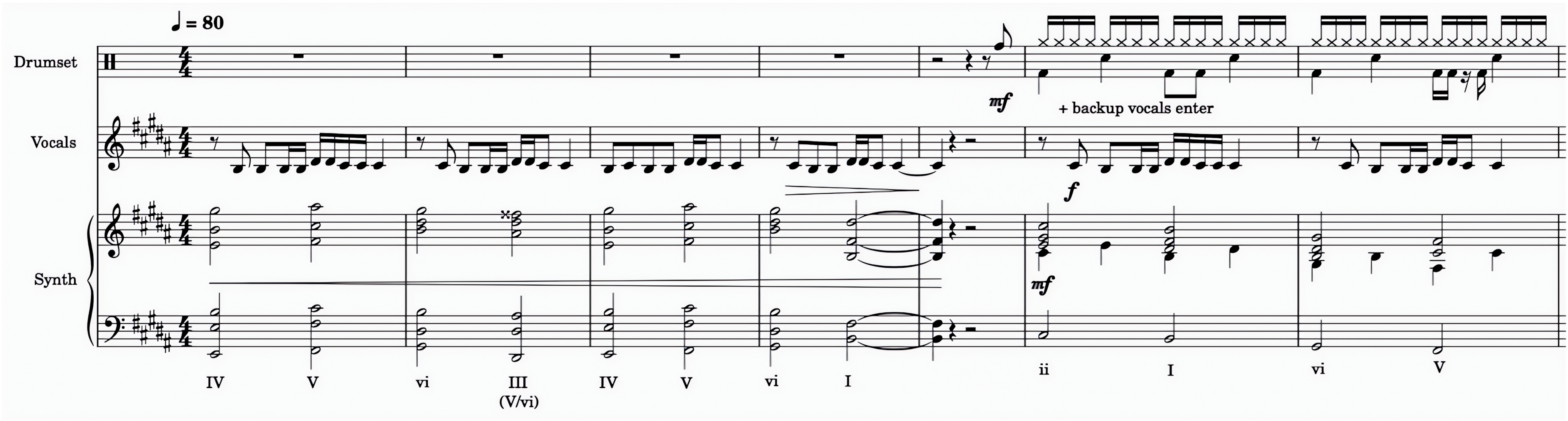 Example 20. A score representation of Glass Animals’ “Heat Waves.” Four measures of build-up in the bridge followed by a compounding of textural cues that lead into the final chorus in the sixth measure. Accompanying audio coincides with the end of the bridge into the final chorus (2:40-3:01) to exemplify The Release.
