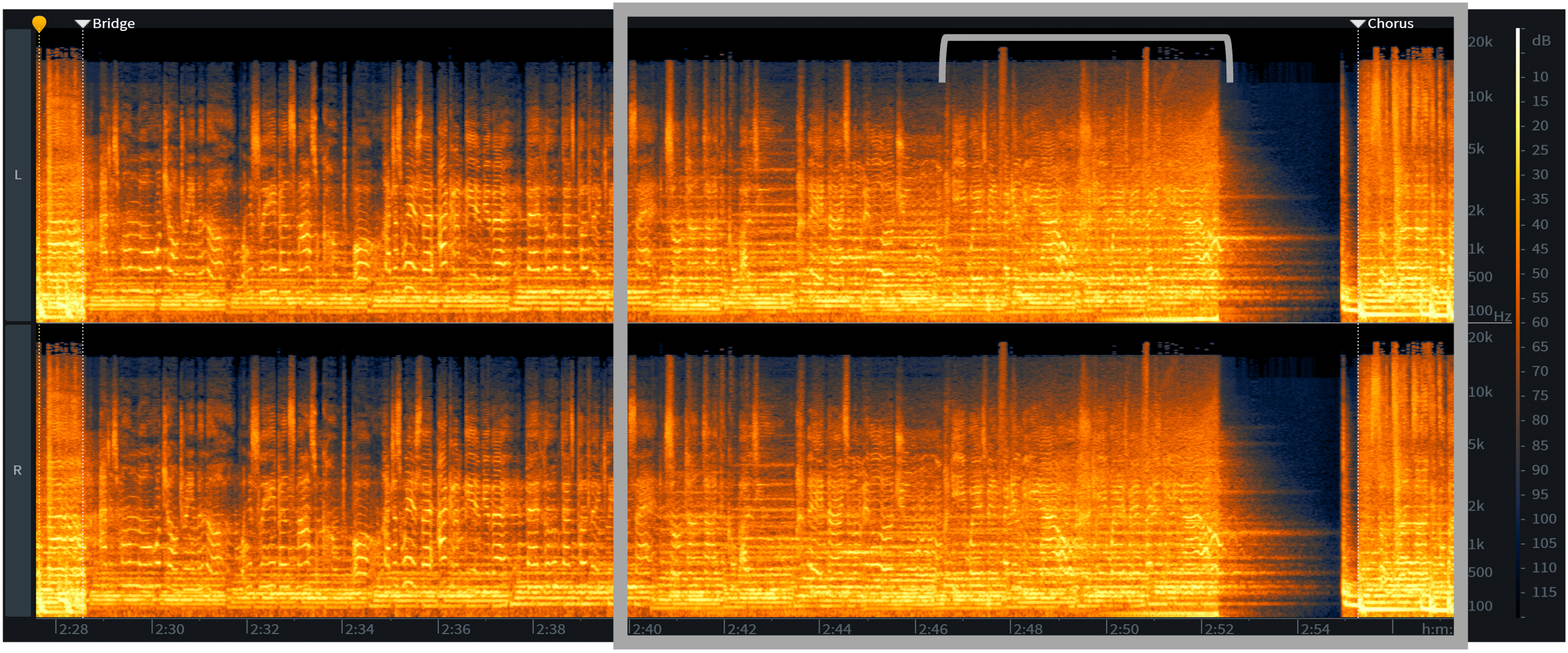 Example 21. A spectrogram of “Heat Waves,” zoomed to focus specifically on the bridge→chorus section. The gray box encompasses the music notated in Example 20, while the gray bracket highlights the inclusion of higher frequencies as heard in the melodic soar cue.