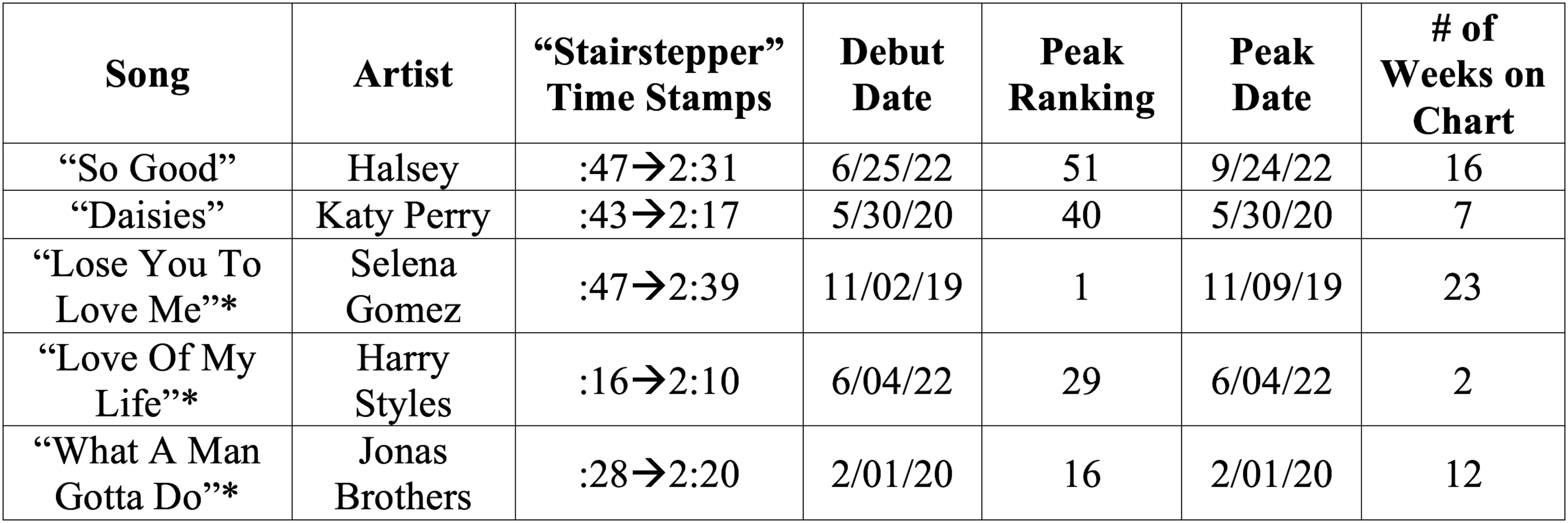 Example 28. Billboard Hot 100 information for five examples of Type 3: The Stairstepper songs. Songs marked with (*) are considered the “Escalator” sub-type (see [3.14]).