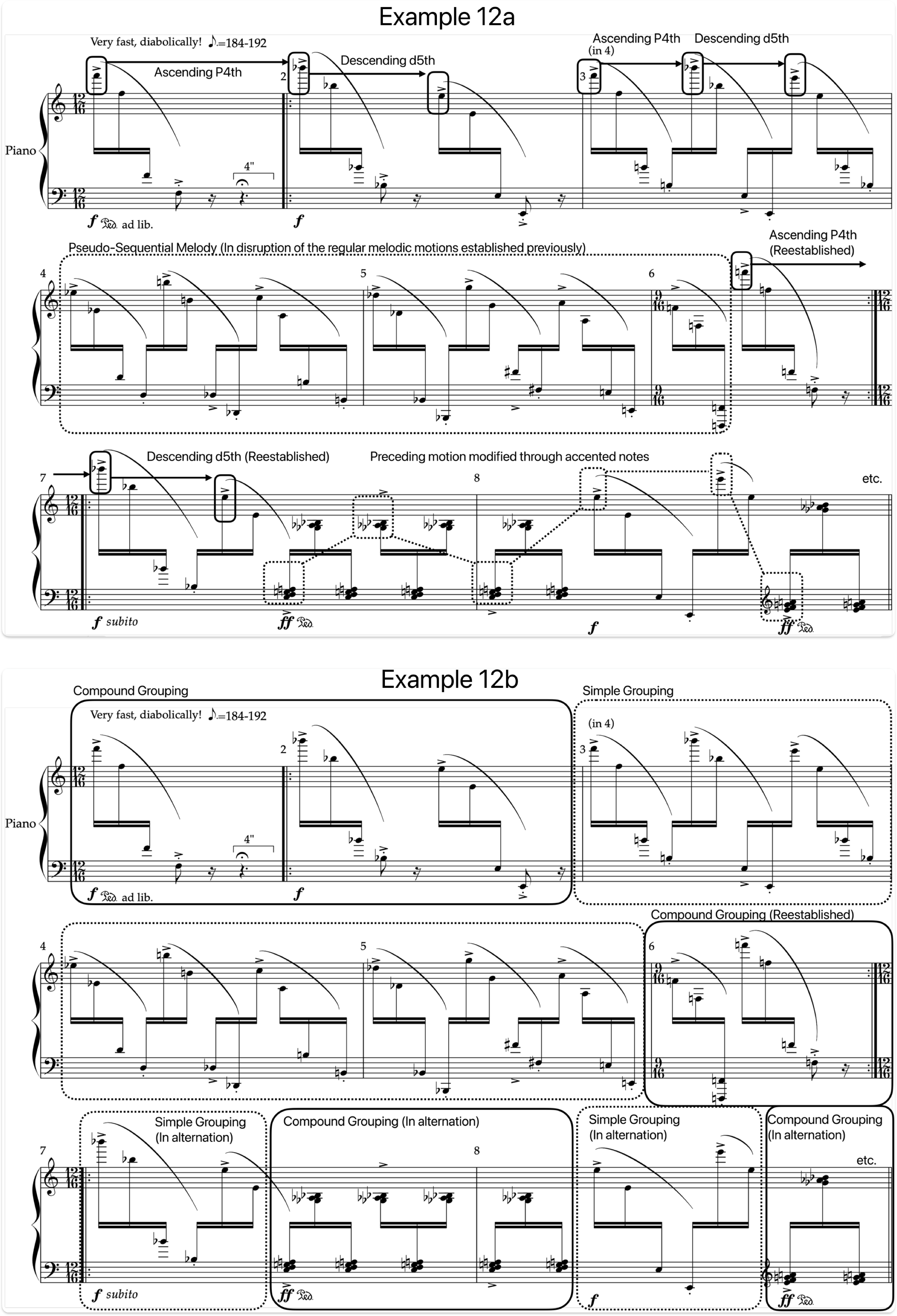 Example 12. Regularity versus irregularity in melody (top) and meter (bottom), mm. 1–8 of “Mudang” by Burge