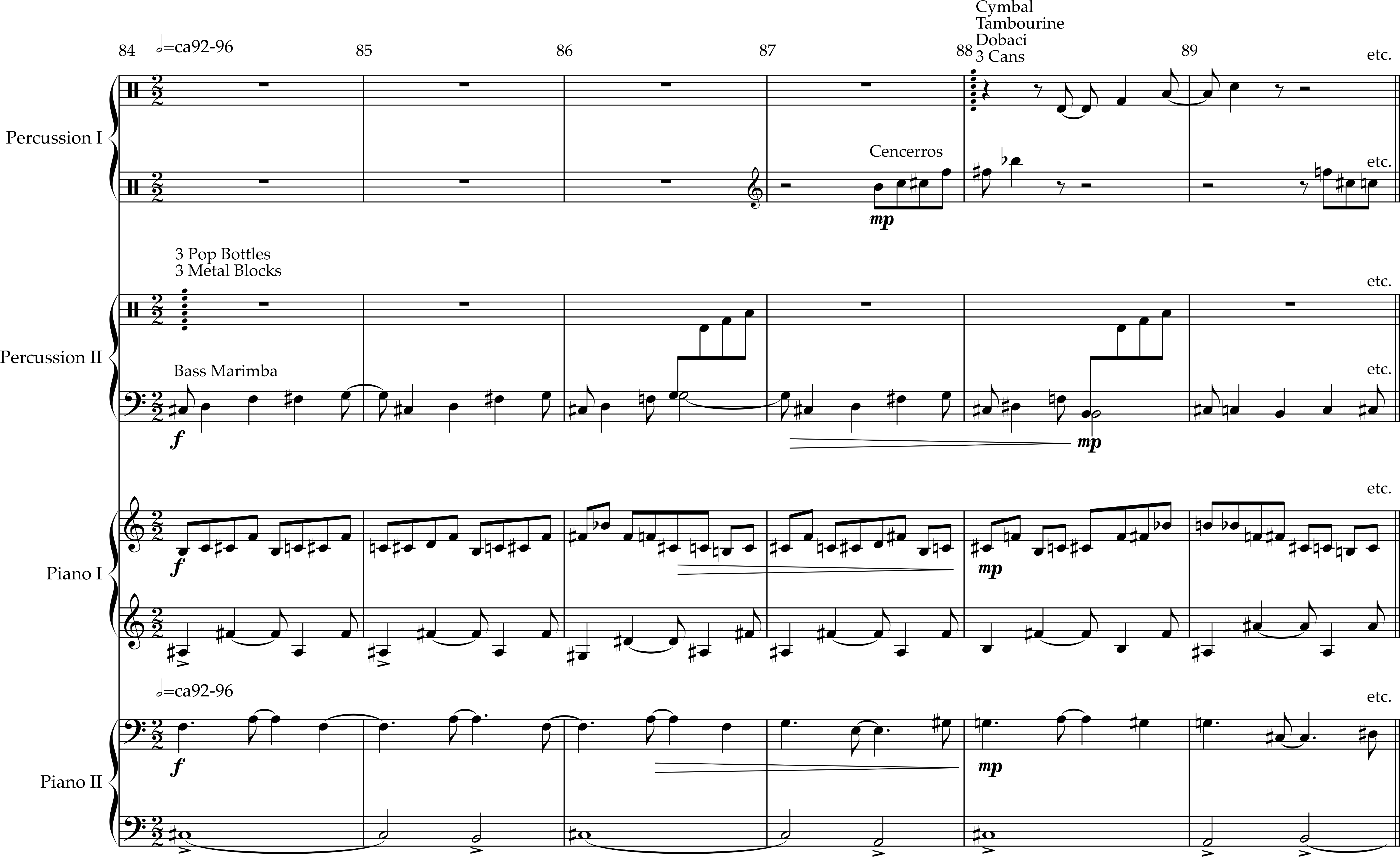 Example 26. Mm. 84–89, Gougalōn I (Percussion and Pianos only)