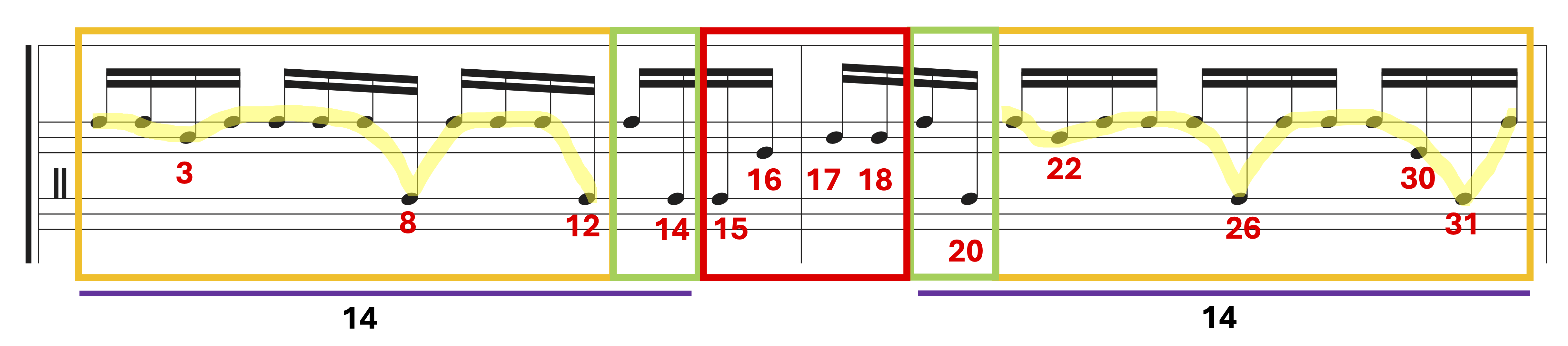 Example 11. Chiastic structure embedded in the solo part for player B in mm. 16–17. The red numbers indicate the position of each sixteenth note relative to the beginning of m. 16. The yellow rectangles reflect thematic similarity based on sporadic deviations of timbres from the uppermost line. The two sixteenth notes in green boxes surround the core of the chiasmus, indicated by the red box. The purple line and the number below represent the total number of sixteenths before and after the red segment (14).