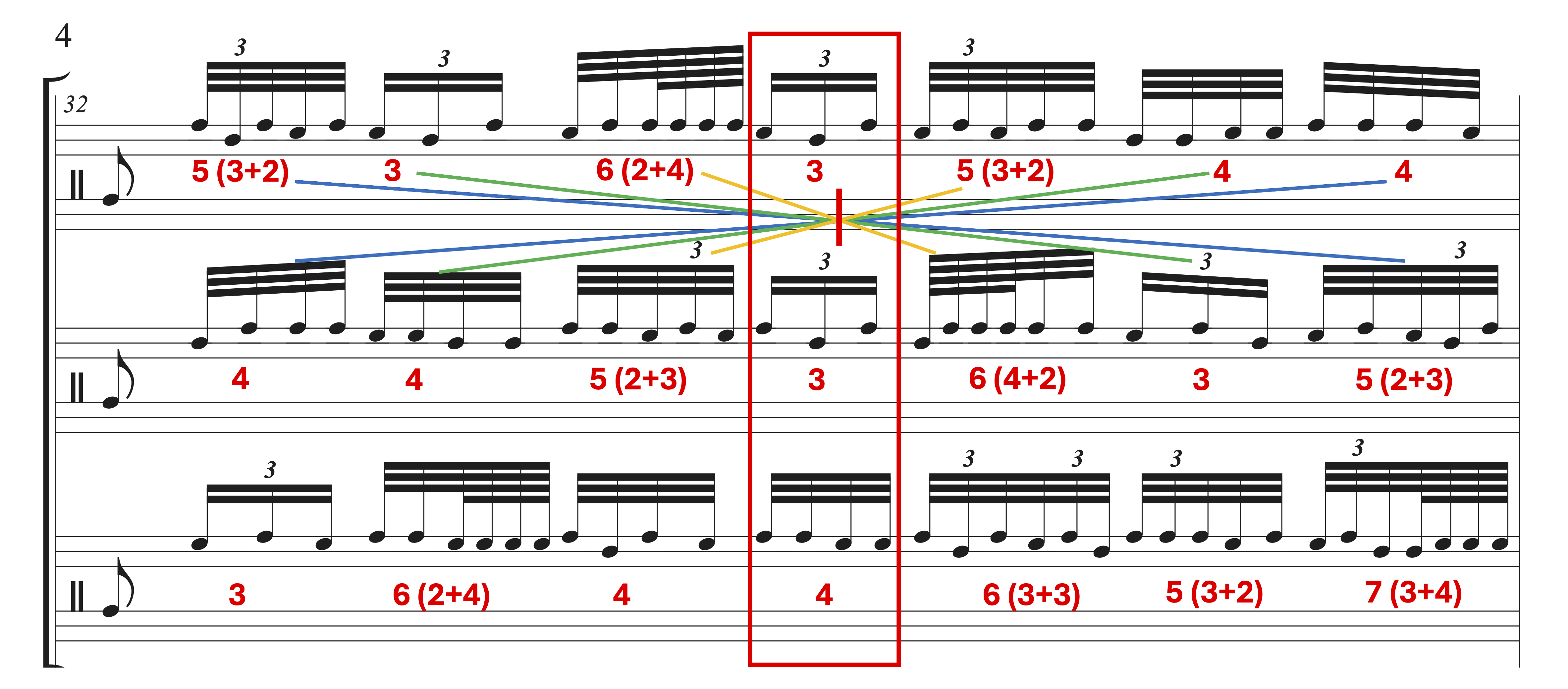 Example 13. Chiasmus embedded within player A and B in m. 32. Numbers of notes played in each 8-note grouping are marked below their rhythms. Note the difference in how rhythms are manipulated to avoid unison textures between parts. An example is the fifth eighth-note segment, which has 5, 6, 6 for each player, but the rhythms are arranged differently for players B and C.