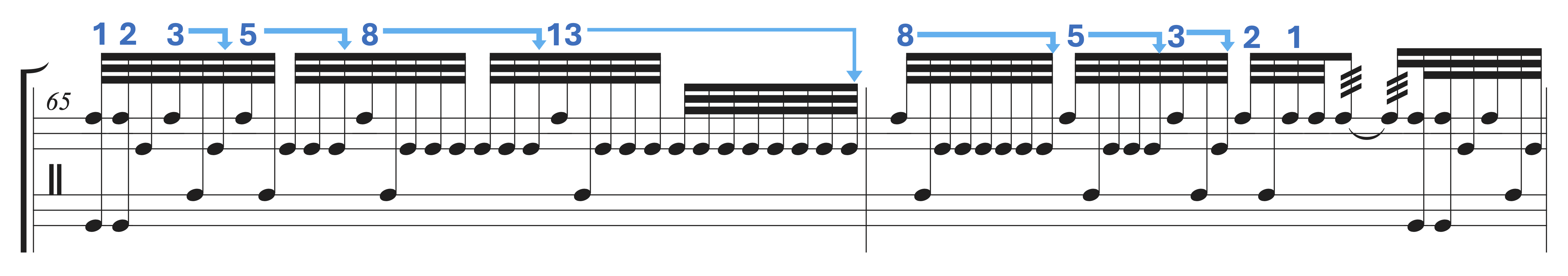 Example 14. How the palindromic structure starting from sequence 13 would lay out in two measures (mm. 65–66). The blue numbers indicate the amount of thirty second notes starting from the bord claqué résonnant before its next reoccurrence.