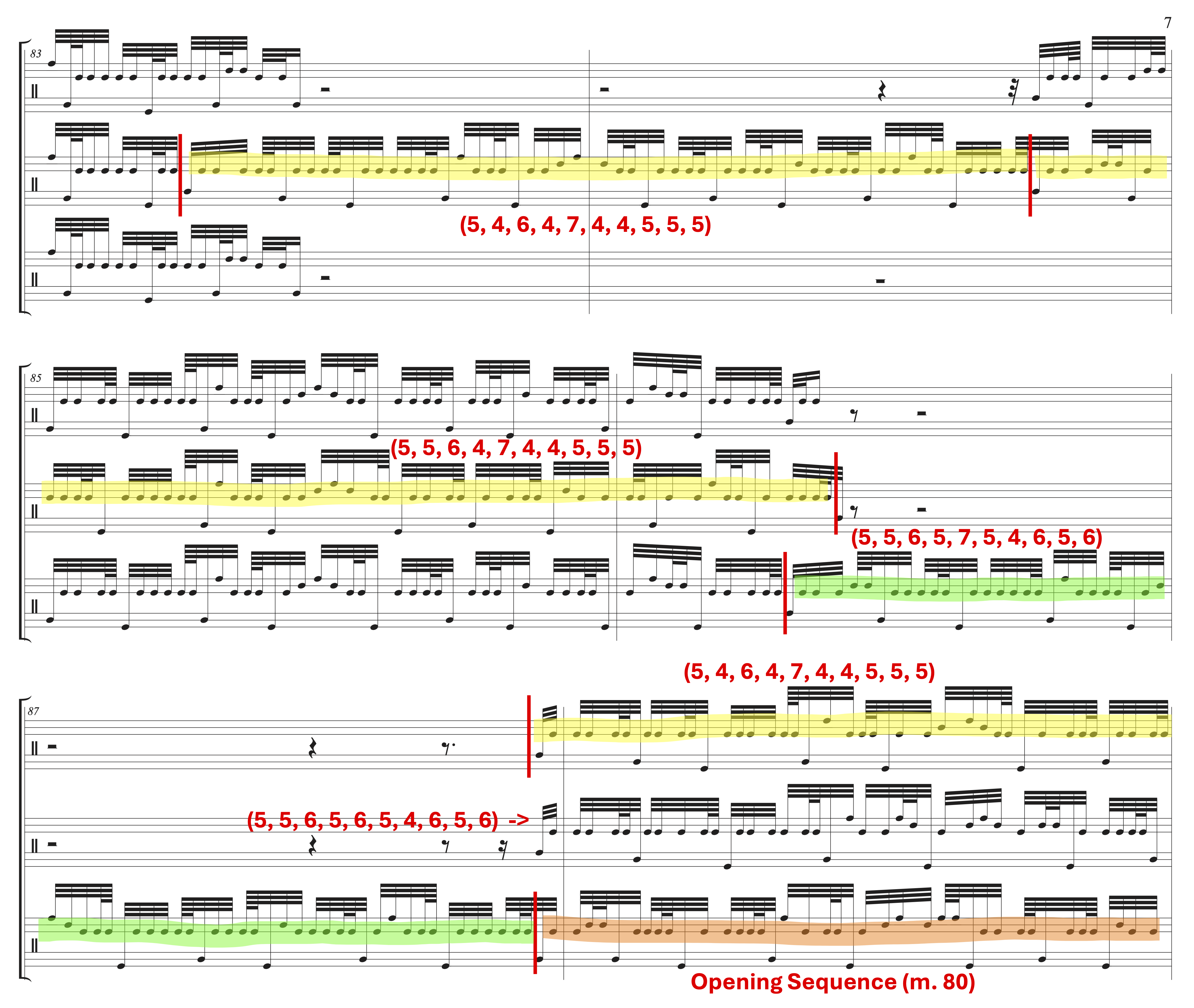 Example 18. Larger chiastic structure in mm. 83–88. The yellow and green structures exhibit similarities between intervallic structures. The green structure will be repeated in the subsequent example.
