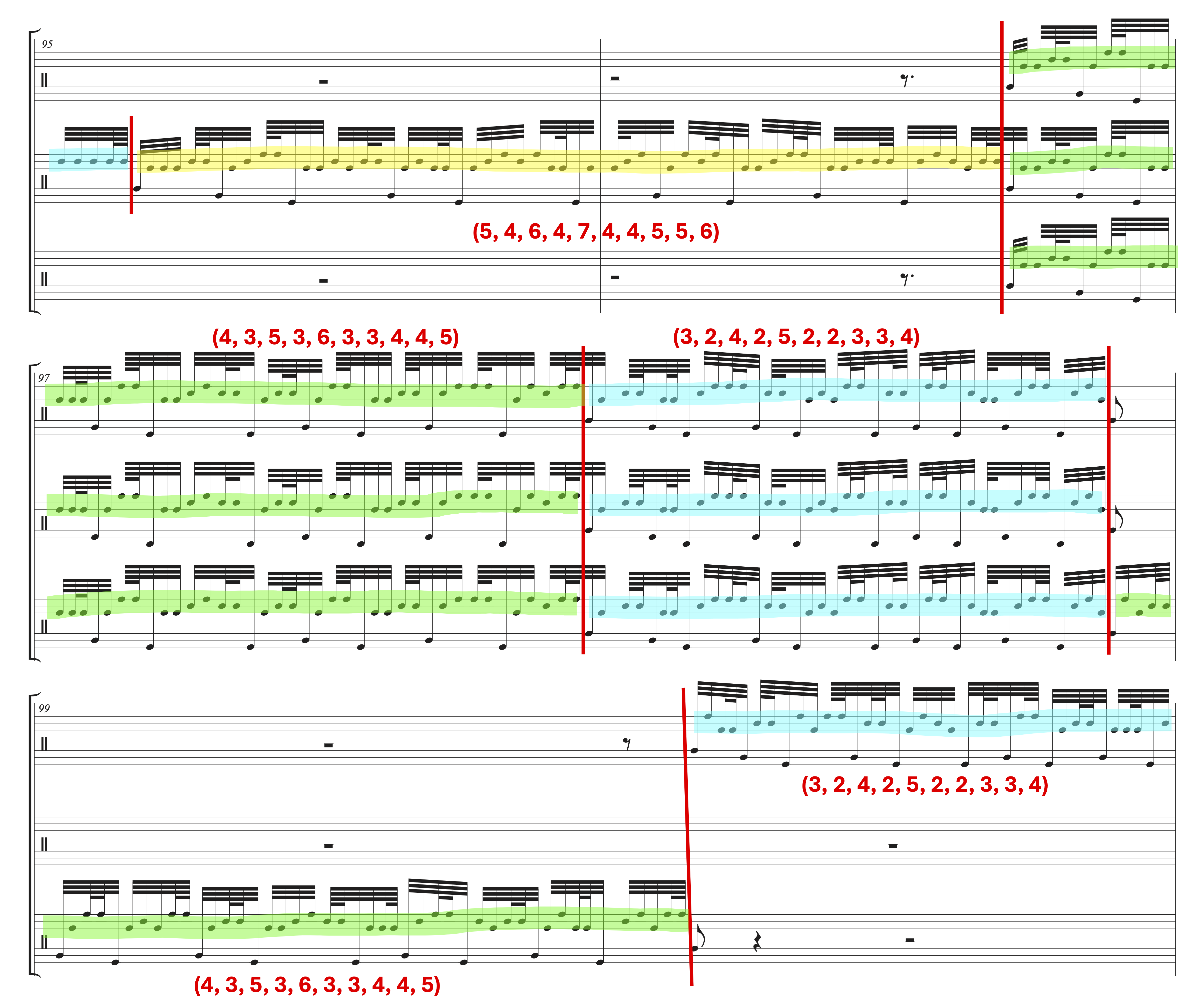 Example 20. Final large-scale symmetric structure from m. 96. Here, Xenakis emphasizes a contrast in texture through employing unison tutti, or solo passages with similar material. Identical intervallic sequences are found between structures highlighted in green, and others highlighted in turquoise.