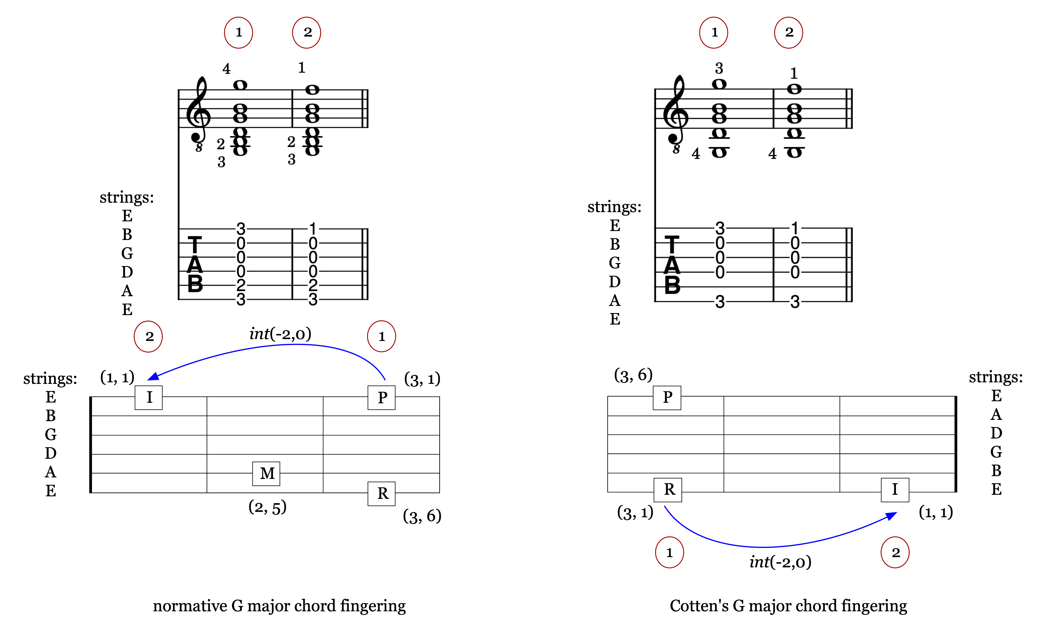 Left: Chord voicing transcription, tablature, and fretboard movement schematic for G major to G7 transition in normative practice. Numbers in red circles indicate temporal order of finger positions (see correspondence with red-circled numbers above transcription).