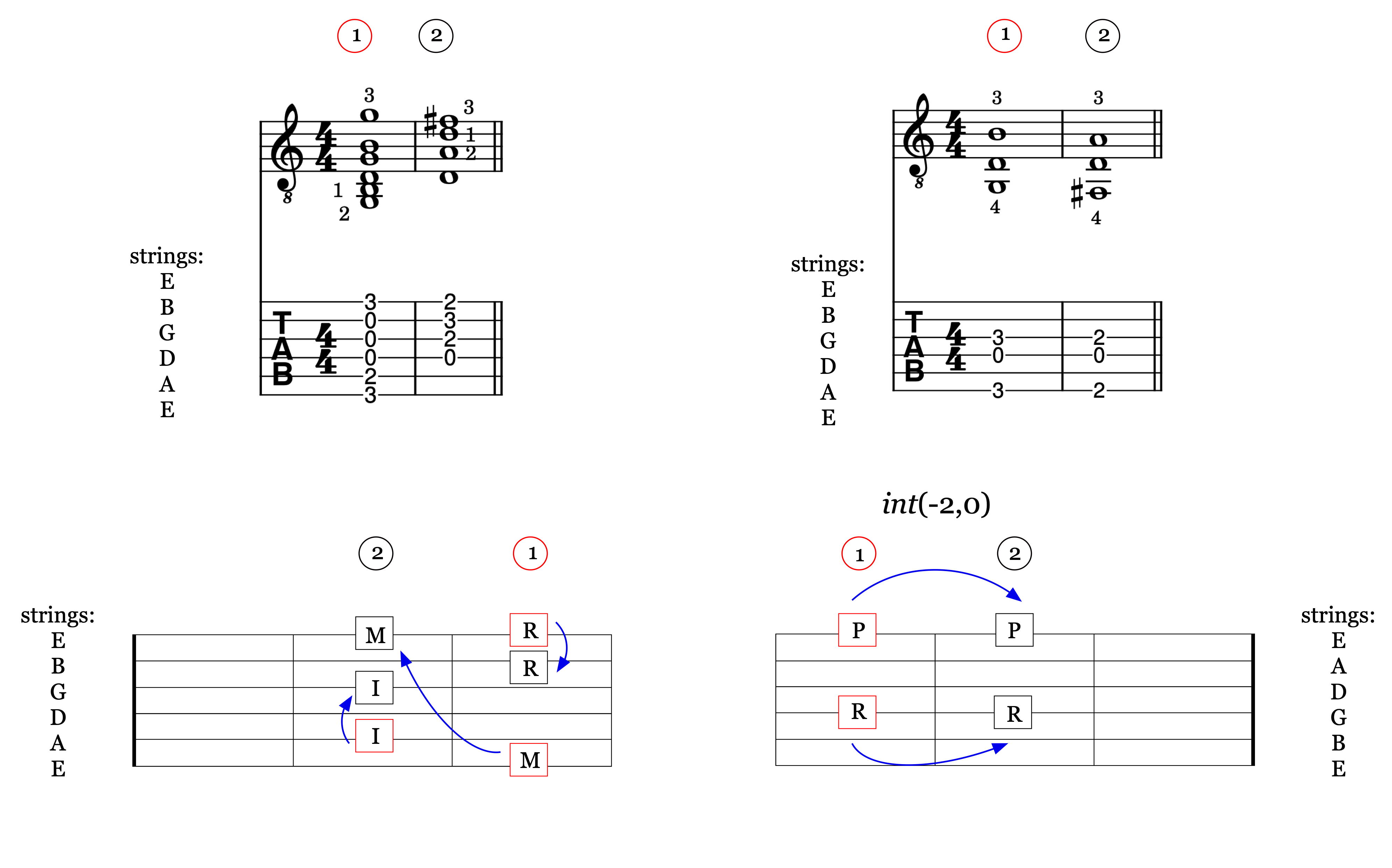 Left: Chord voicing transcription, tablature, and fretboard movement schematic for G major to D major transition in normative practice. Right: Chord voicing transcription, tablature, and fretboard movement schematic for Cotten’s G major to D major transition in “Honey Babe Your Papa Cares For You” (1958)