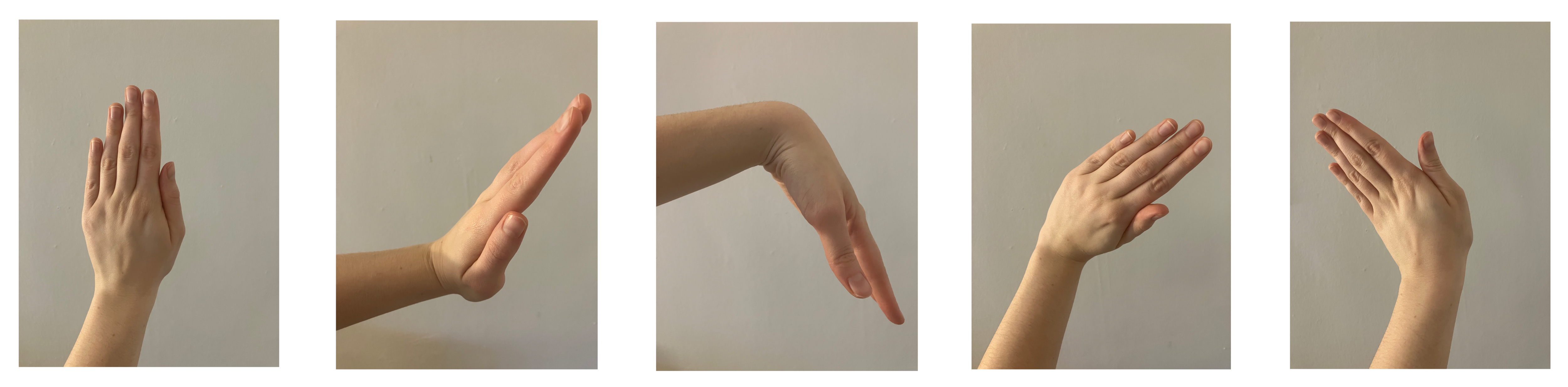 From left: neutral wrist, extension, flexion, radial deviation, ulnar deviation