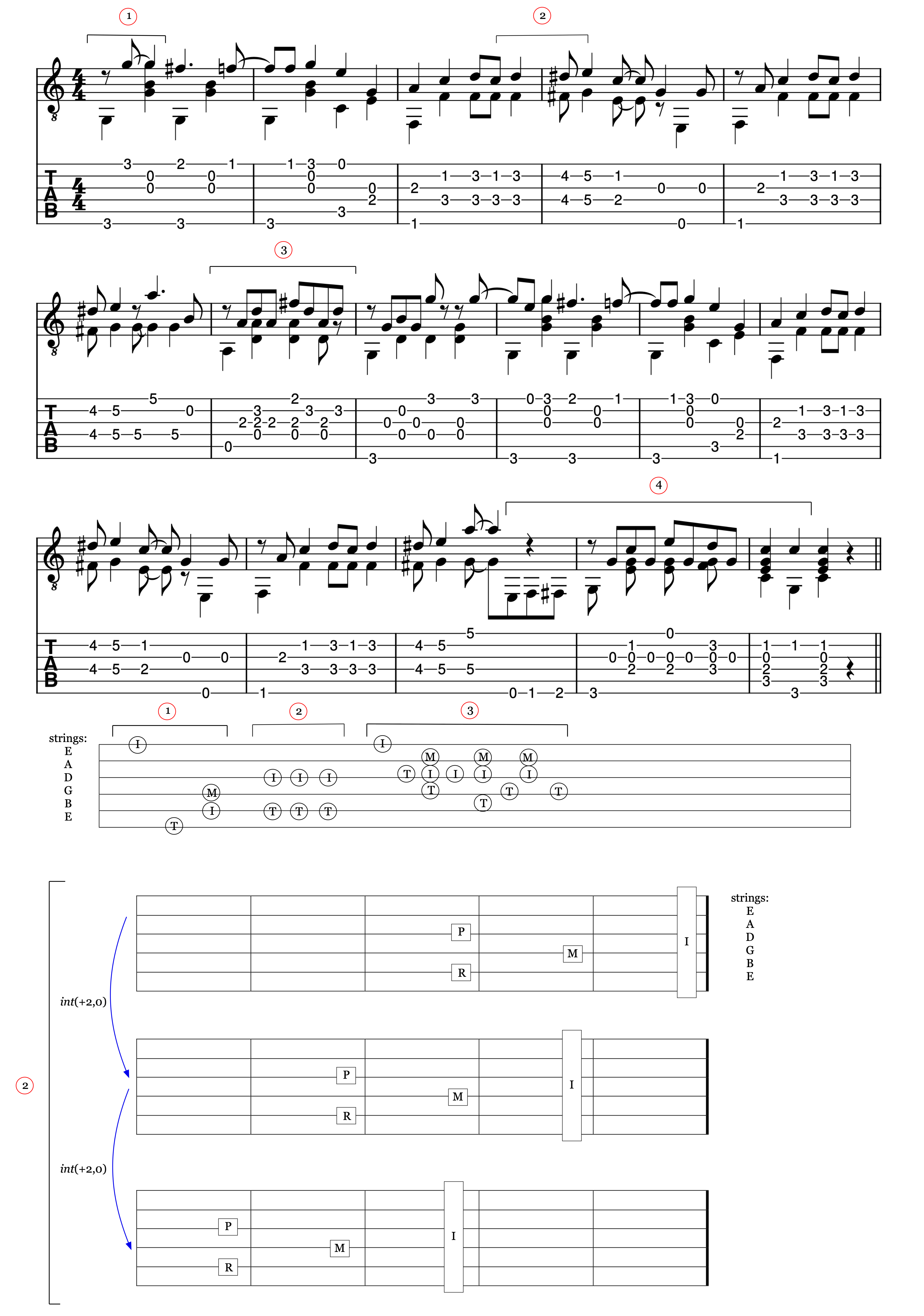 Example 14. Transcription, tab, select picking patterns, and select fretboard diagrams of the opening theme of “Washington Blues” (Fuller and Cotten 1992, 7:19–7:45). Transcription and tab are my own.
