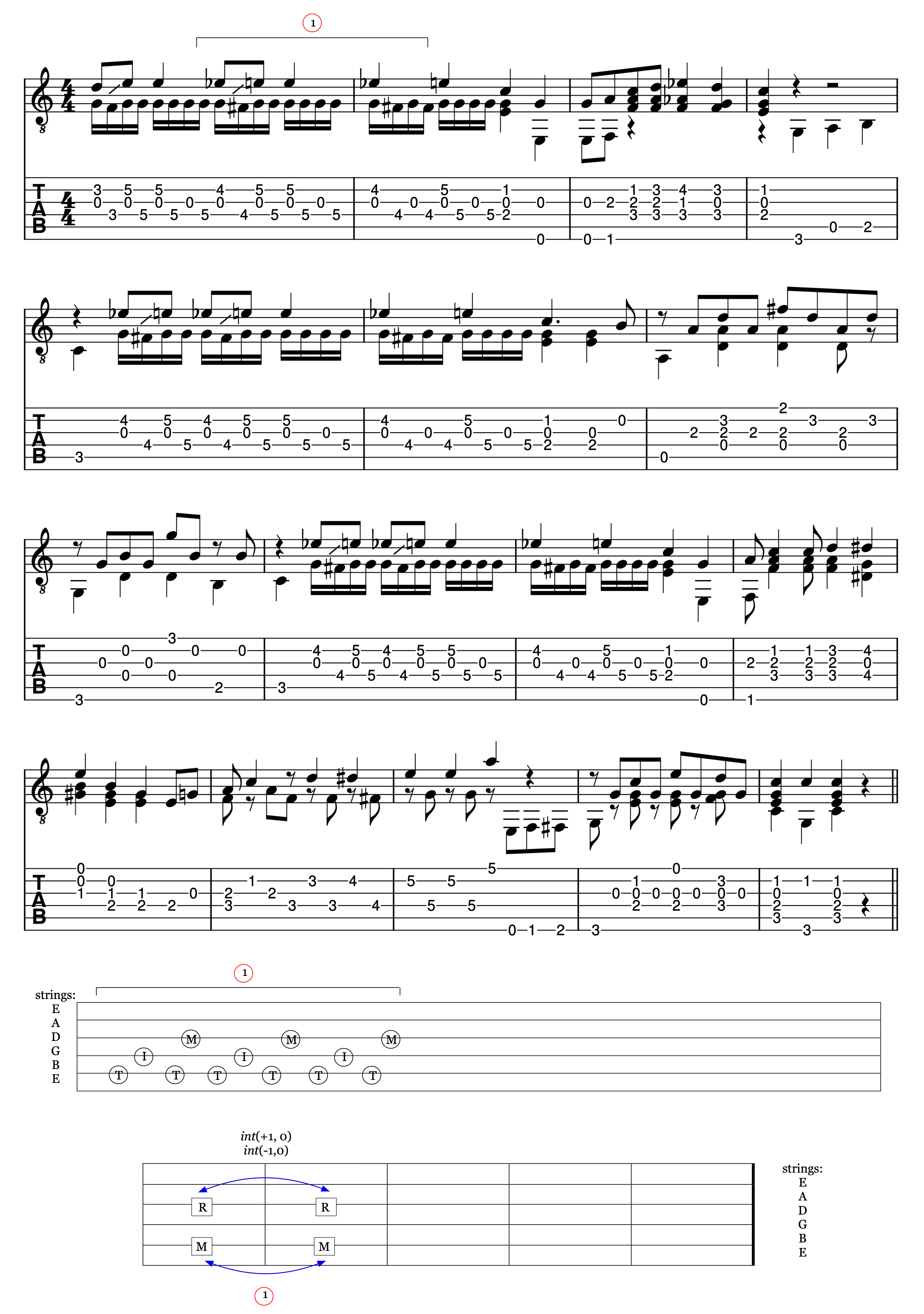Example 16. Transcription, tablature, select picking patterns, and select fretboard diagram for second variation of “Washington Blues,” part 3 (Fuller and Cotten 1992 8:12–8:40)