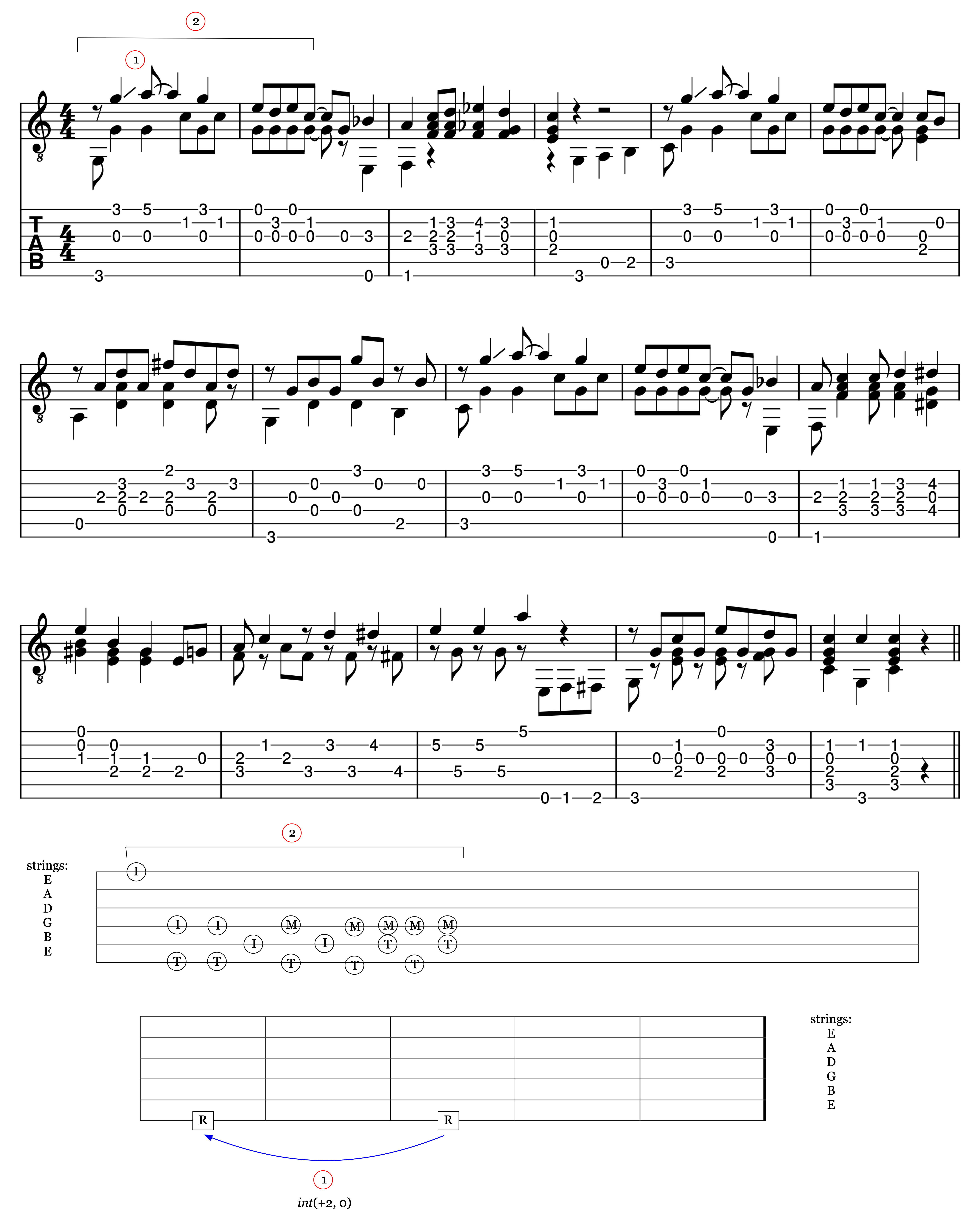 Example 17. Transcription, tablature, select picking patterns, and select fretboard diagram for third variation of “Washington Blues,” (Fuller and Cotten 1992, 8:40–9:05)