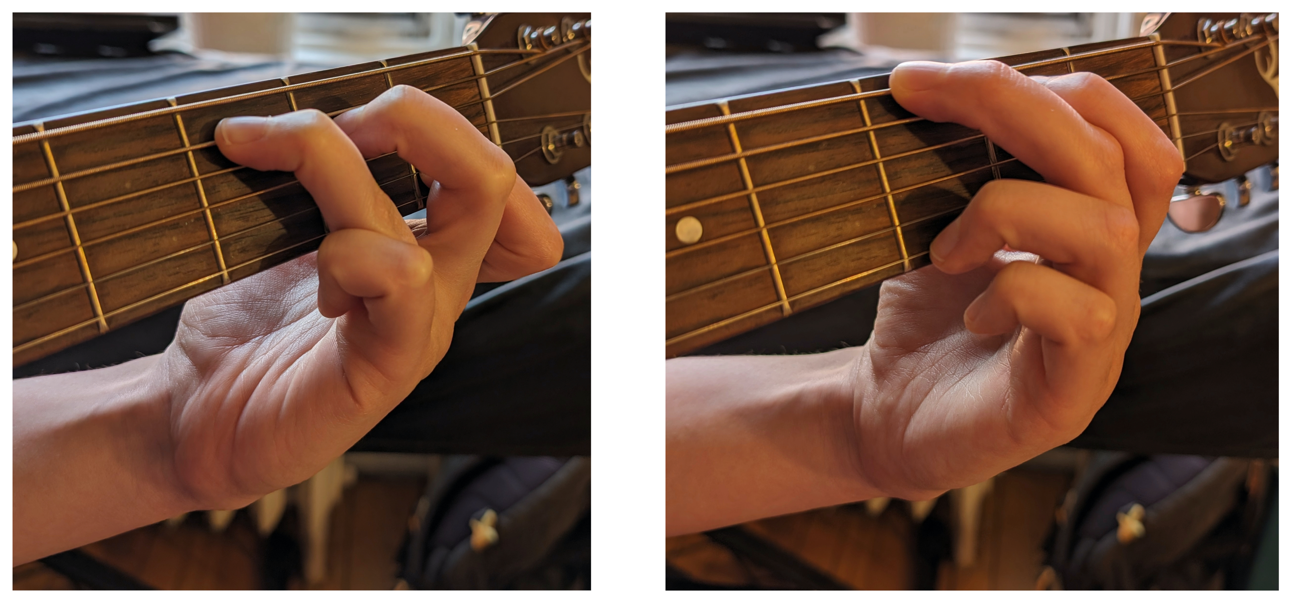 Example 6. Examples of common guitar chords that violate the neutral wrist preference by aligning the index finger with higher-pitched strings at the bottom of the instrument. From left: C major, G major.