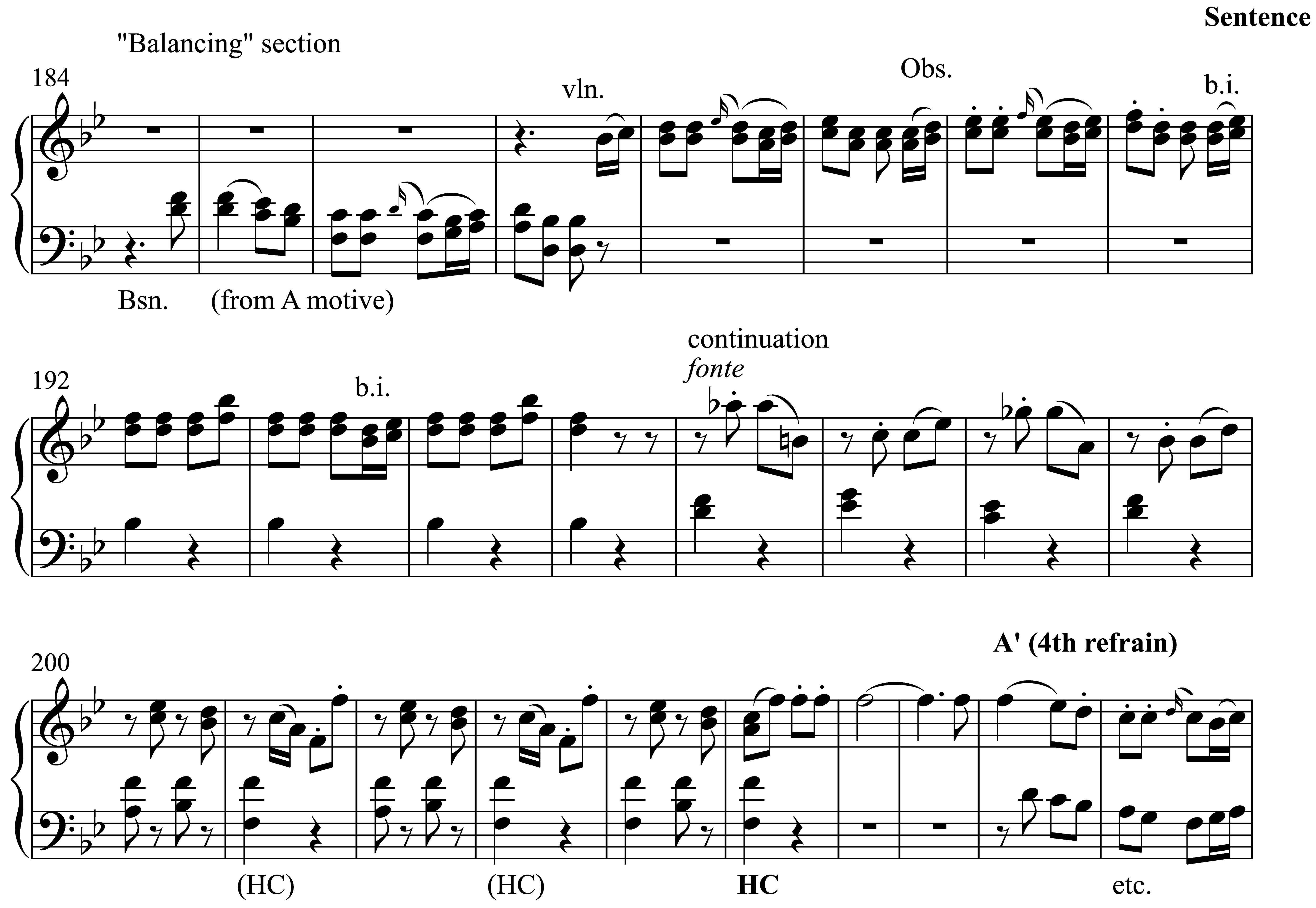 Haydn, Symphony No. 66, balancing section (mm. 184–209)