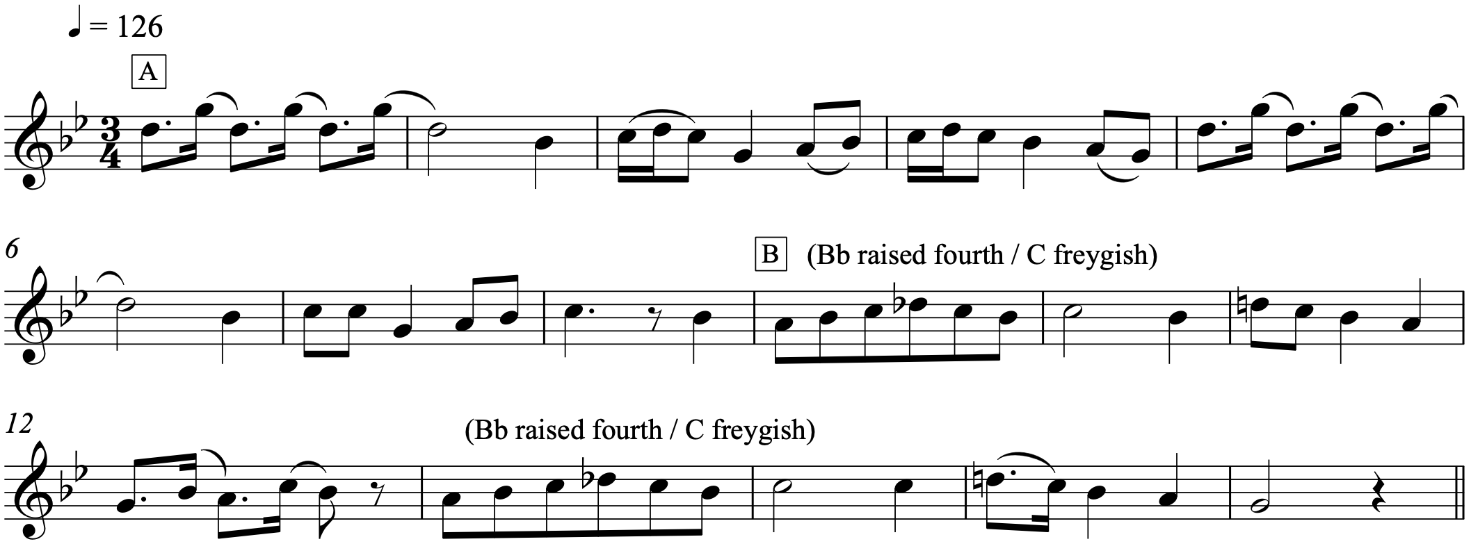 Example 12. Dobriden no. 1 (Beregovski 2015), sections A and B. Recording made in 1930 in Odessa by the actor Gurovich (Vernadsky National Library of Ukraine 2013, track 40).