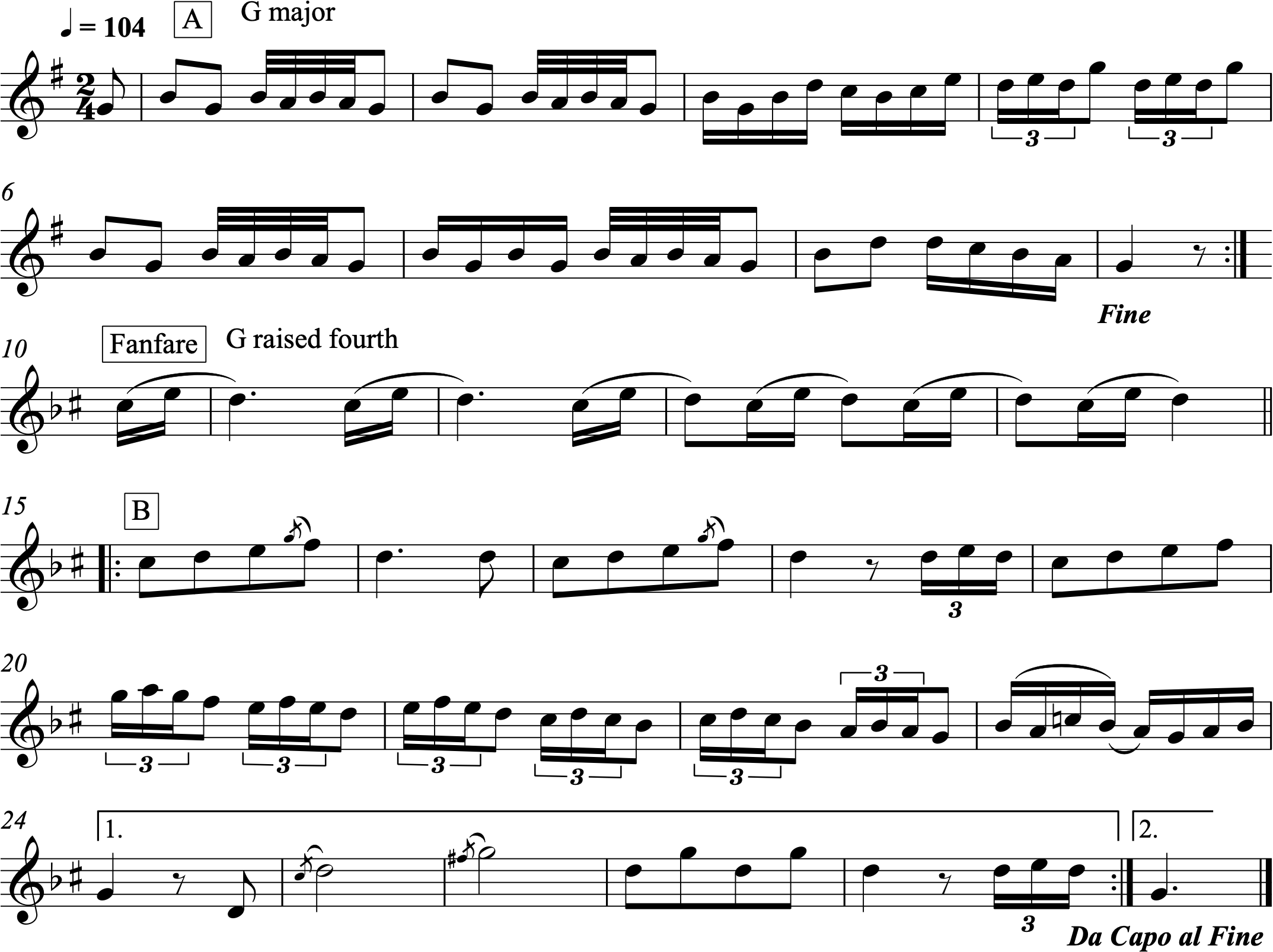 Freylekhs no. 150 (Beregovski 2015), modulation from G major to G raised fourth