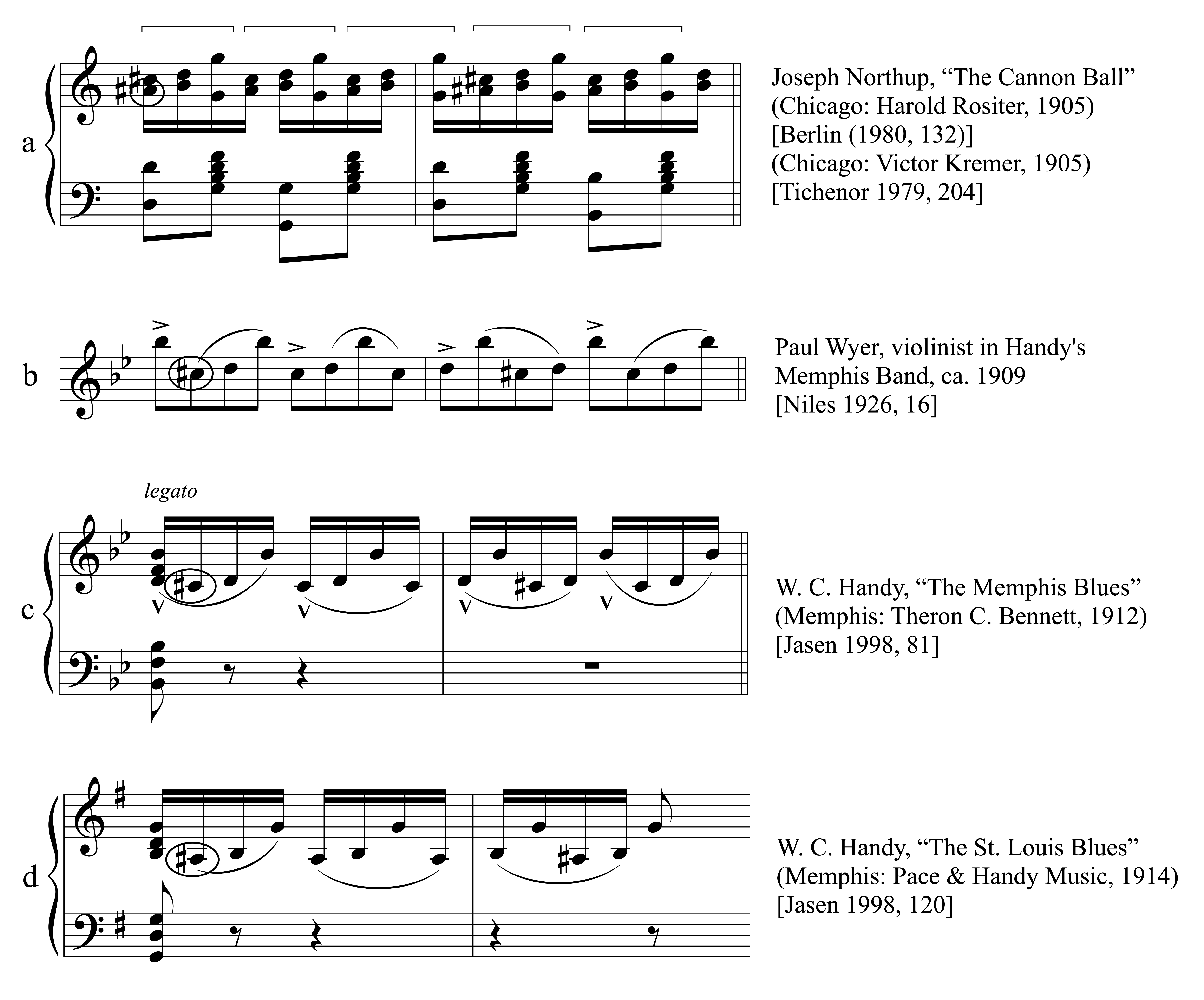 “Secondary rag” in a 1905 ragtime work and as “breaks” in blues works
