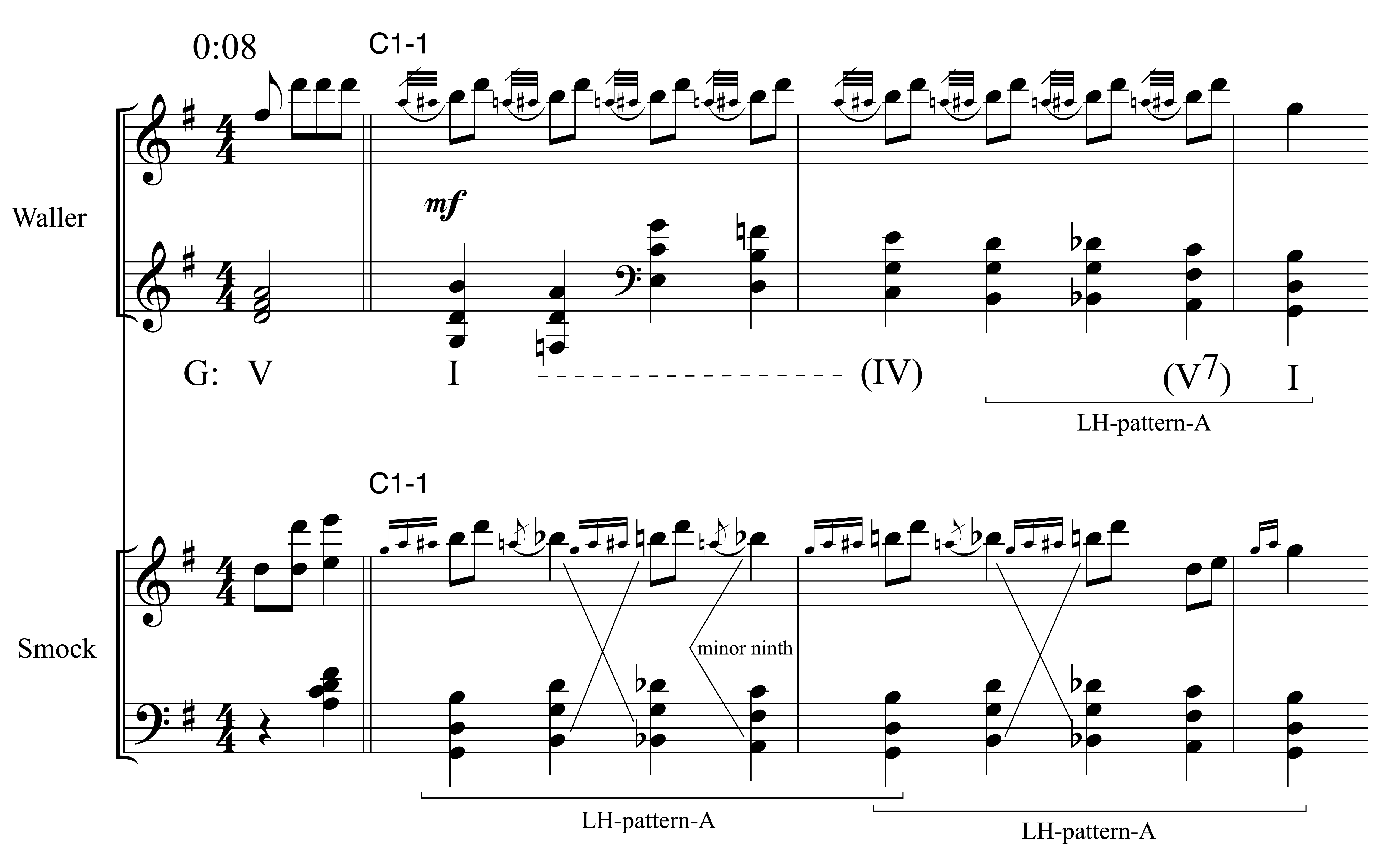 Example 27. Opening thematic idea of Fats Waller’s “Numb Fumblin’” (1929) vs. Jim Smock’s “Hot’n Blue,” Lopez Book III (1934a, 140–41)