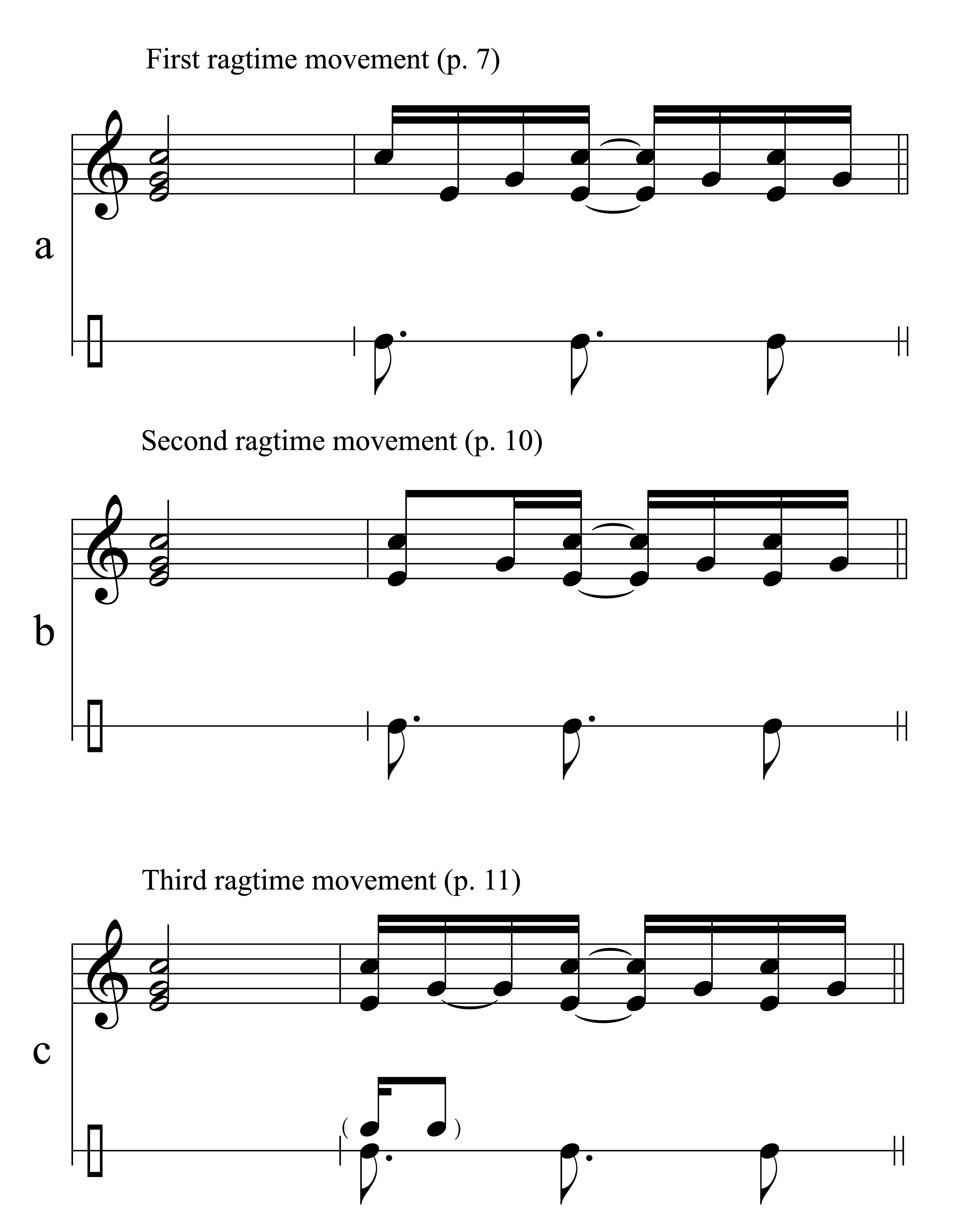 Example 4. Christensen’s second and third ragtime movements compared to the first movement (1909, 10–11)