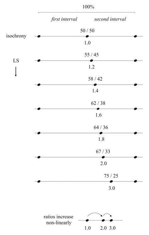 Example 2. Benadon’s Figure 1.1, a “ratio cheat sheet” showing increasingly large long-short (LS) swing ratios, with ratios rounded to one decimal point