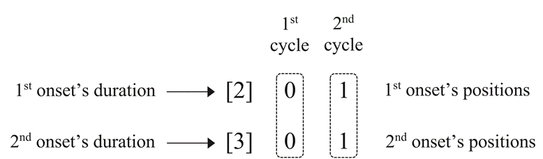 Benadon’s Figure 8.15, an attack matrix for the 23 rhythm shown in Example 12