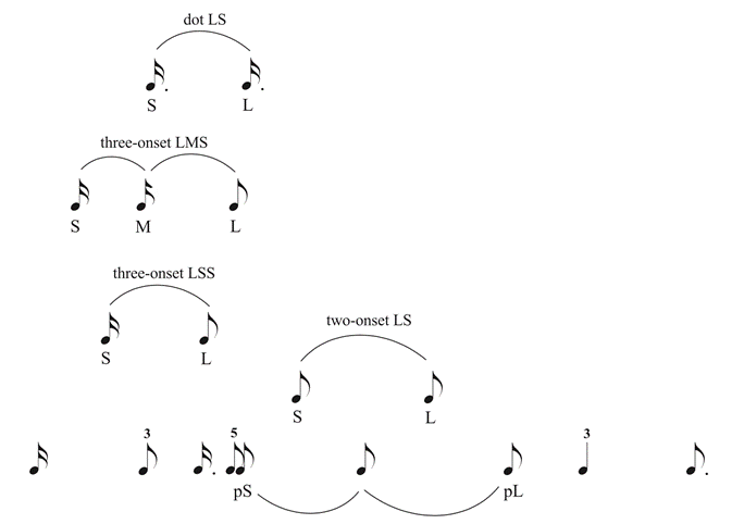 Example 3. Benadon’s Figure 1.22, showing prototypical ratio relationships between short (S), medium (M), and long (L) durations, complete with “new” durations (pS and pL, two-onset LS, three-onset LSS, three-onset LMS, and dot LS) and their relationship to more familiar duration values. Arcs represent 1.22 ratios