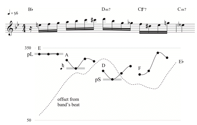 Example 4. Benadon’s Figure 1.24, an analysis of Anat Cohen’s recording of Louiguy and Édith Piaf’s “La Vie en Rose,” showing how pL and pS serve as reference points for duration length