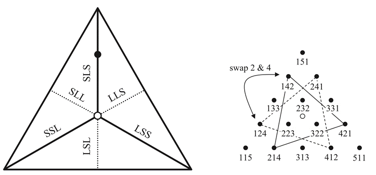 Benadon’s Figure 6.3, depicting the triangular three-onset space