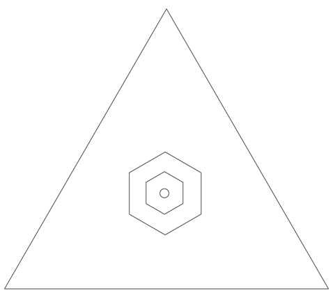 Example 6. The superswing hexagon embedded within onset space. The open circle in the middle of the figure again represents isochrony. The green line shows the length of the first duration, the blue line shows the middle duration, and the red line shows the last duration, with shared numbers in each edge ratio highlighted. The white circle in the center of the triangle indicates isochrony.