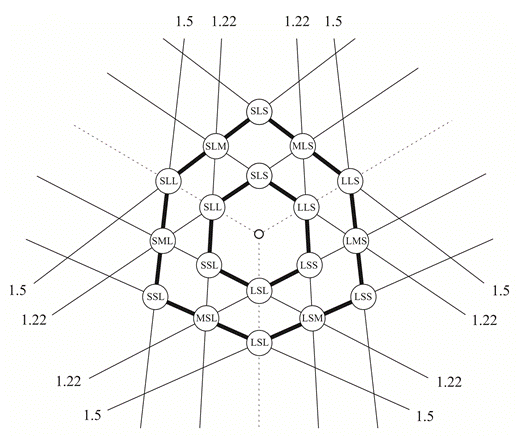 Example 7. Benadon’s Figure 6.4, showing the derivation of the superswing hexagon from 1.22 and 1.5 ratios within onset space. Rhythms that fall within the hexagonal band are superswung, while those that fall outside it are not.