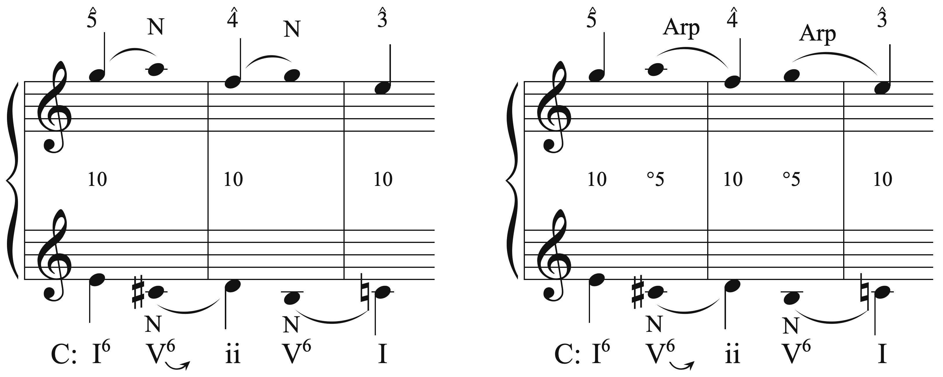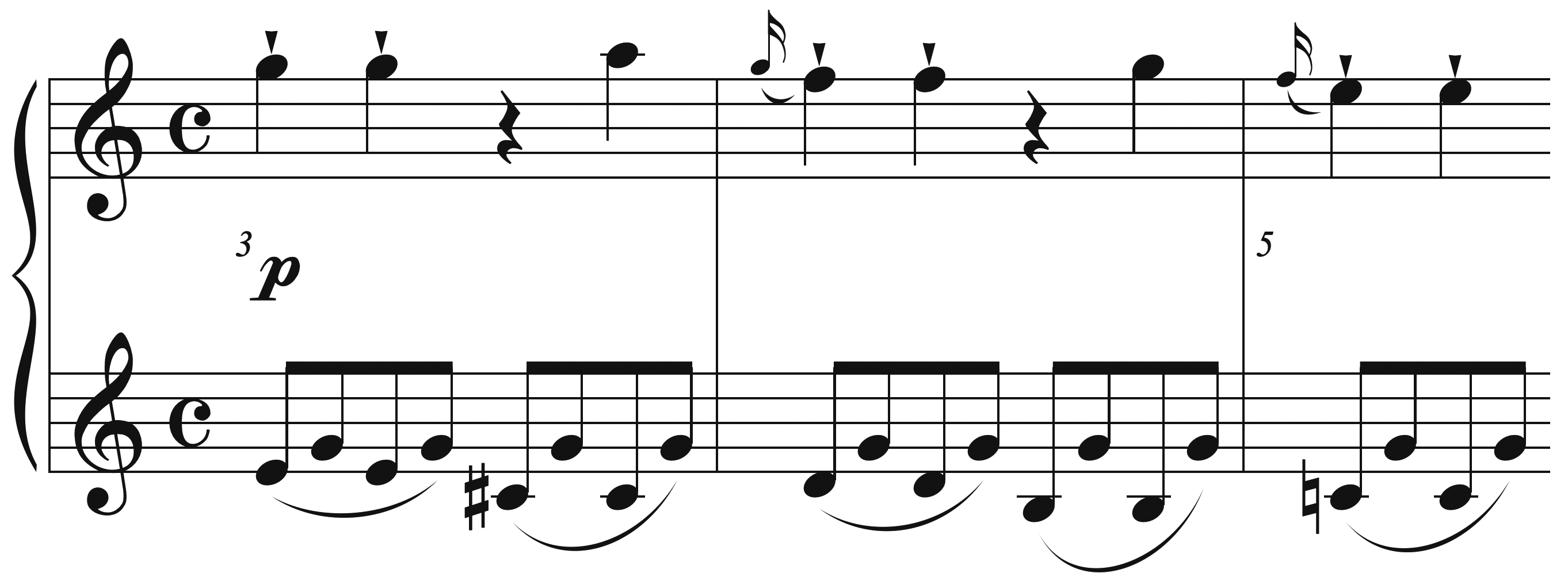 Example 27. Mozart, Piano Sonata in C Major, K. 309: I (a) score, mm. 3–5 (b) interpretation #1 (c) interpretation #2 (preferred)[AB: Same comment as Ex 24]