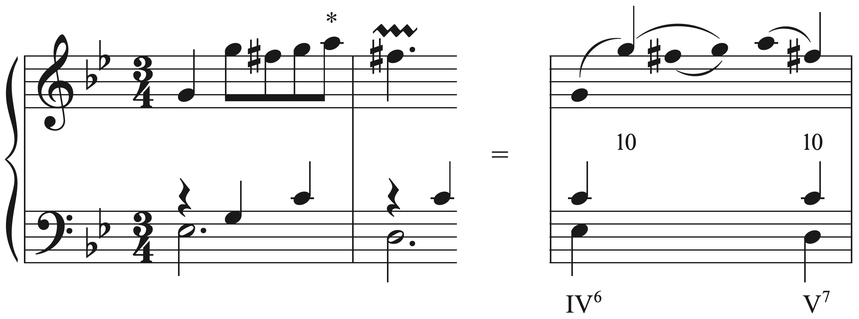 Example 31. Handel, Minuet in G Minor, HWV 434: IV, mm. 13–14 (a) score (b) voice-leading analysis[AB: Same comment as Ex 24]