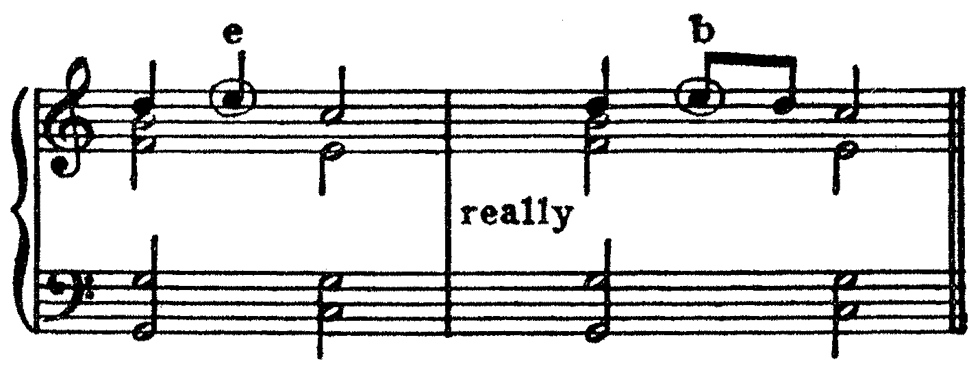 Example 5. Smith and Krone&rsquo0;s illustration of an échappée as an “interrupted neighboring tone” (1934, 182, n.1) NB: labels “e” and “b” refer to changing and neighboring tones (respectively), as keyed to explanatory list