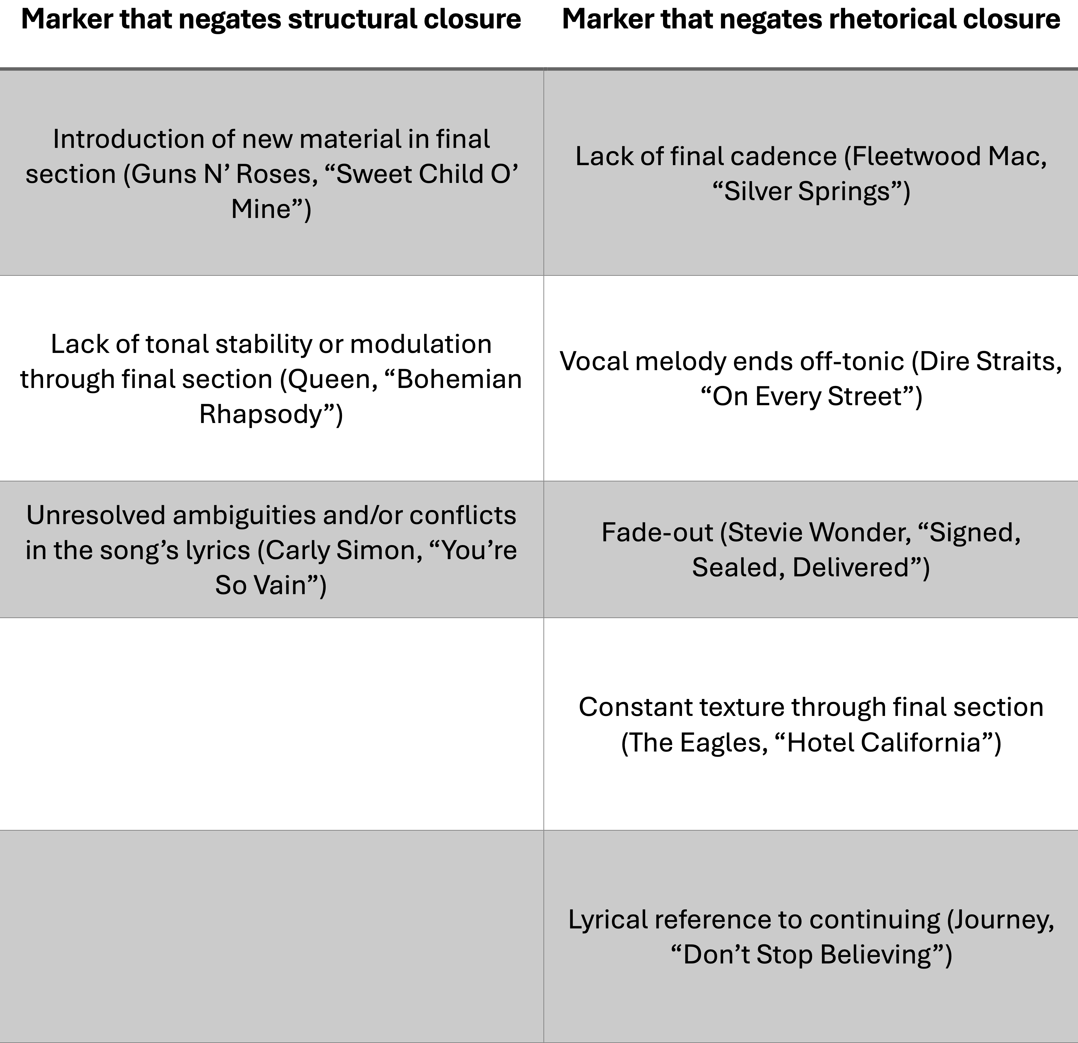 Musical markers that negate structural and rhetorical closure