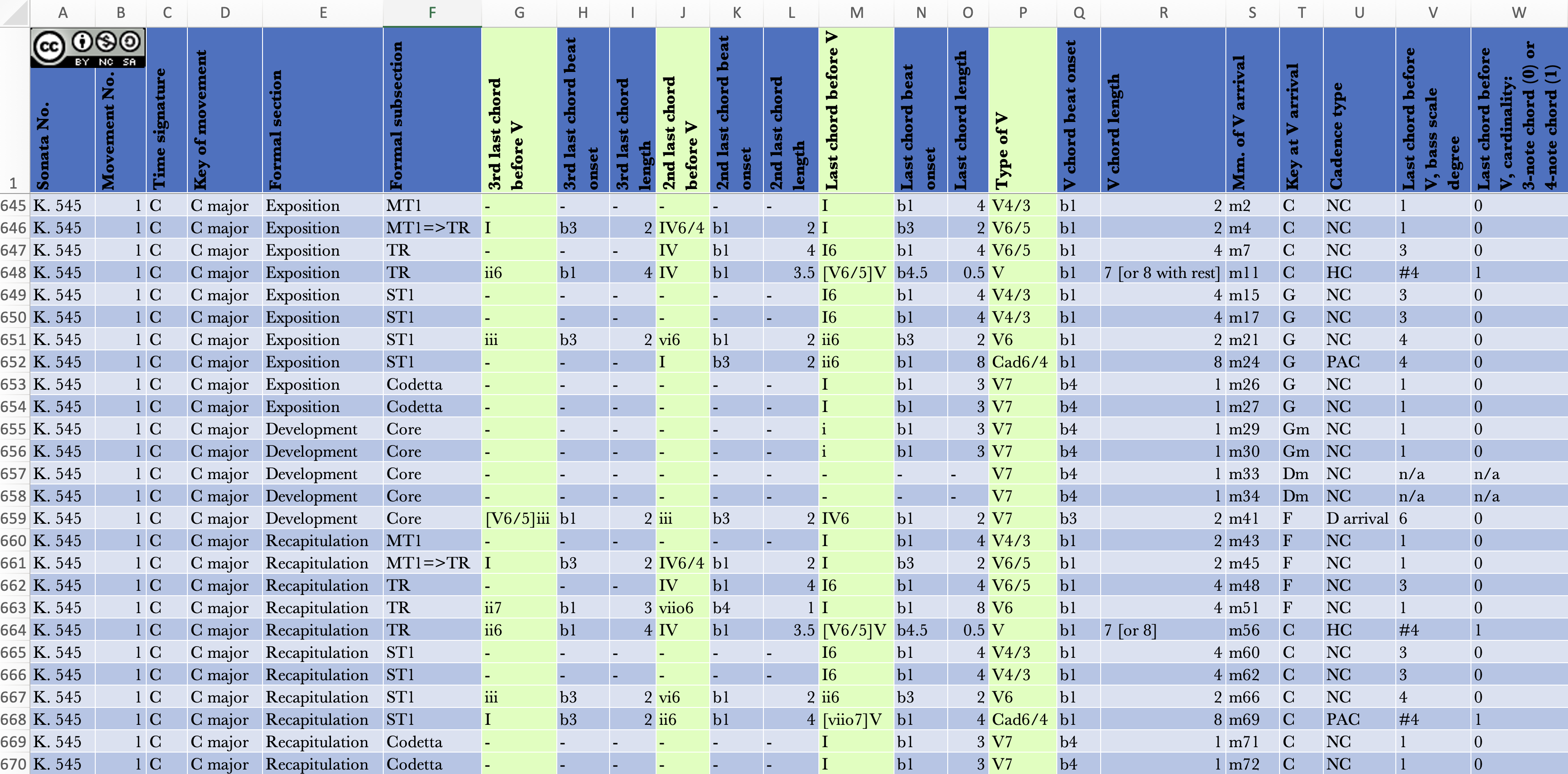 Example 2. An excerpt of the dataset. Rows contain all dominant harmonies along with the three chords preceding each dominant in K. 545/i.