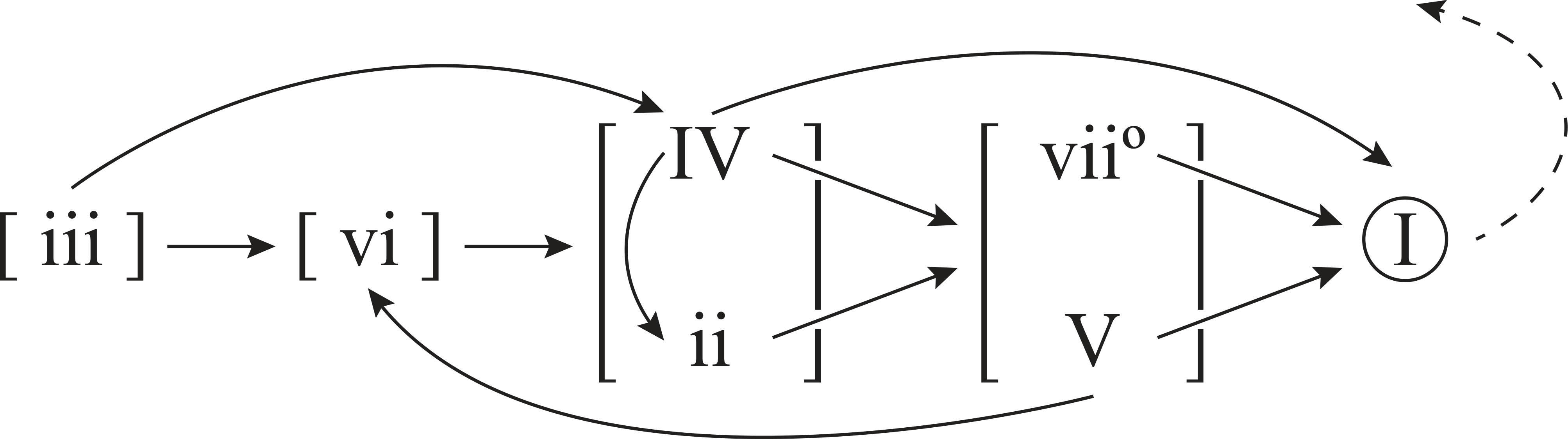 Example 12. A reproduction of frequent chord progressions in the major mode as illustrated in the Kostka and Payne textbook (2009, 111).