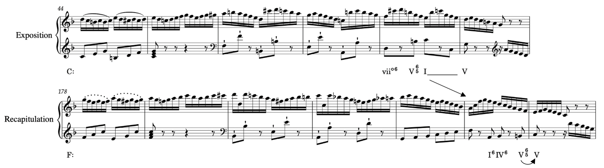 Example 17. A pre-dominant power up with added measures in the recapitulation in Mozart, Piano Sonata, K. 332/iii (end of TR).