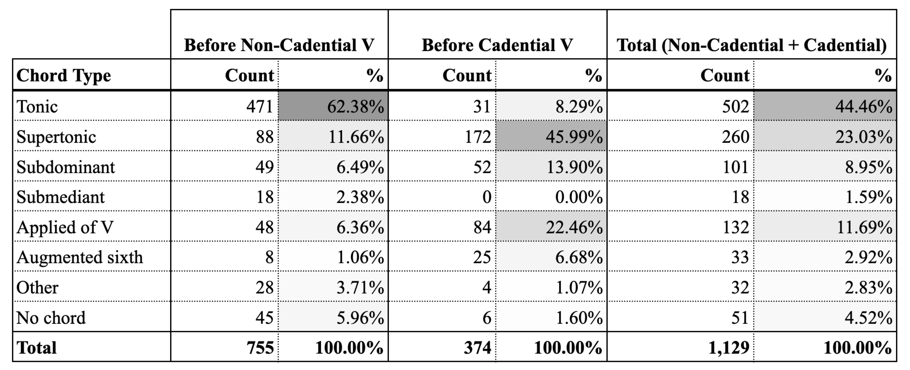 Example 3. Frequency and percentages of V-1 based upon whether the chord is or is not at a cadence. (“Other” includes iii, vii°, ♭II, CT°7, and moments of harmonic ambiguity such as unisons. “Applied of V” includes both applied dominants and applied leading tone chords of V.)
