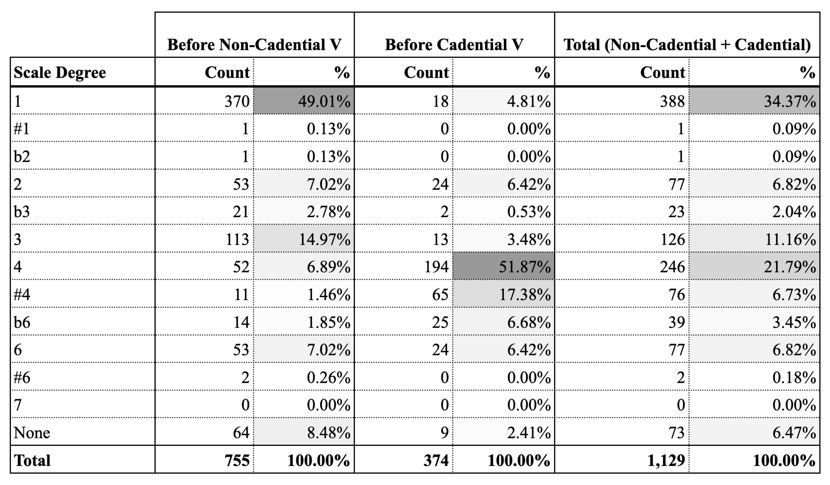 Example 4. Frequency and percentages of bass scale degrees in V-1 based upon whether the chord is or is not at a cadence.