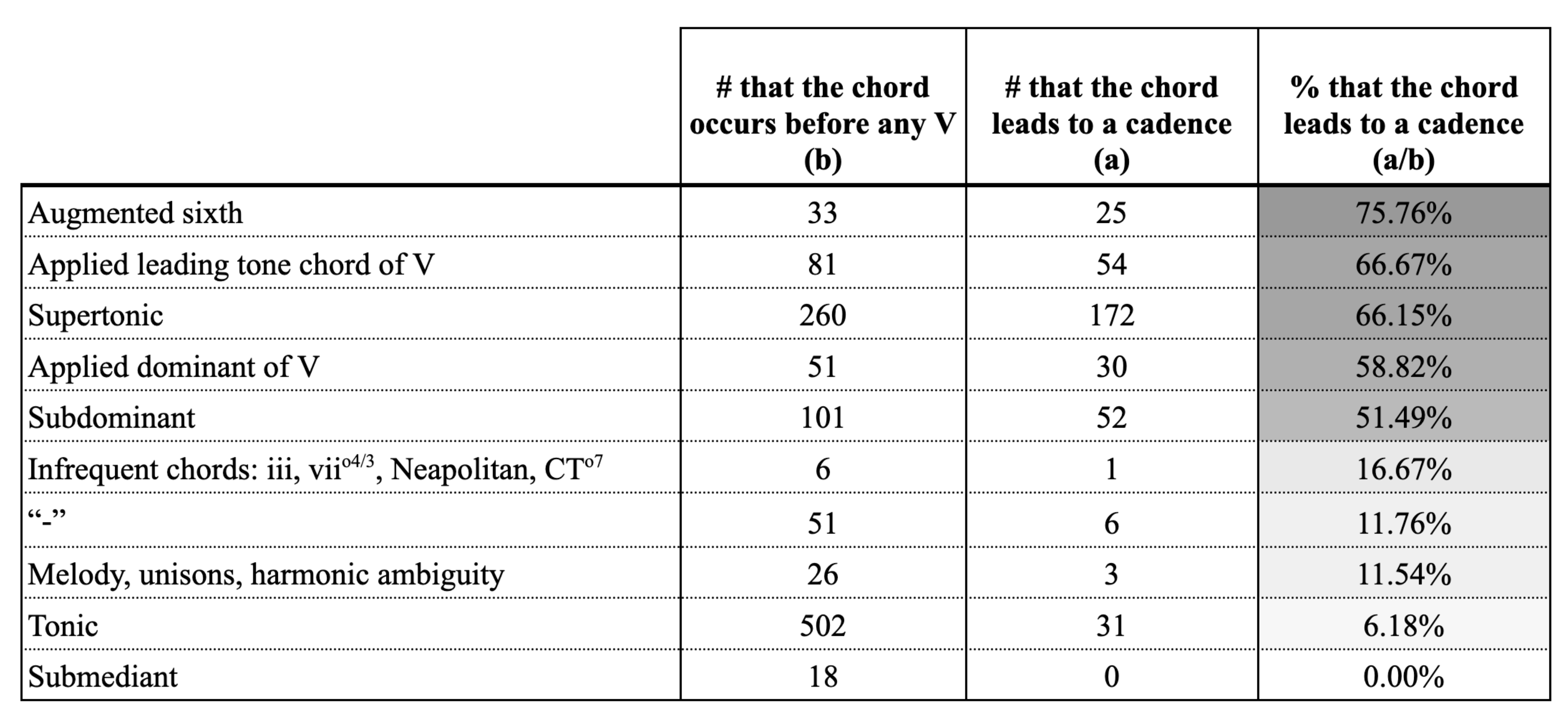 Example 5. Chord types before V in the dataset along with their frequency at various locations, arranged by how often they lead to a cadence (rightmost column).