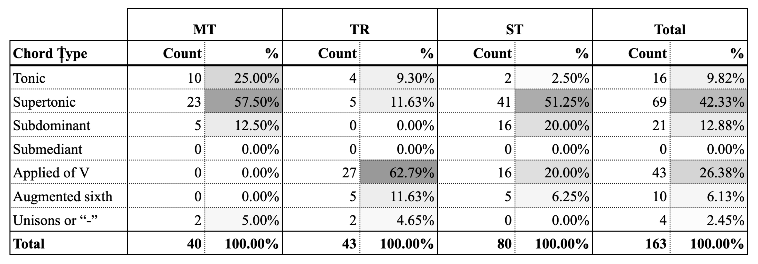 Example 7. Chord types in V-1 at the cadences ending main themes (MT1 and MT2), transitions (TR), and subordinate themes (ST1, ST2, and ST3) in both expositions and recapitulations.