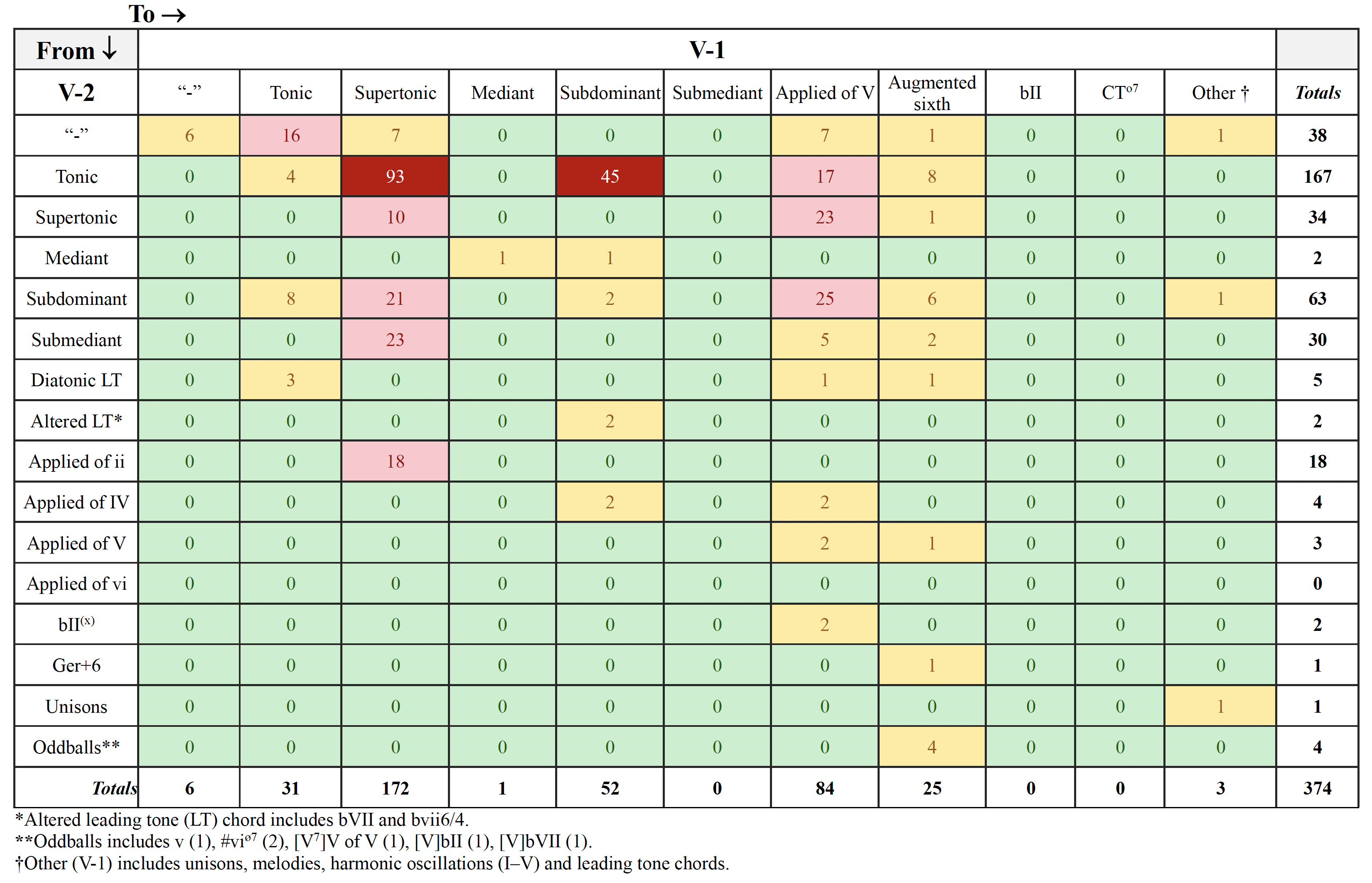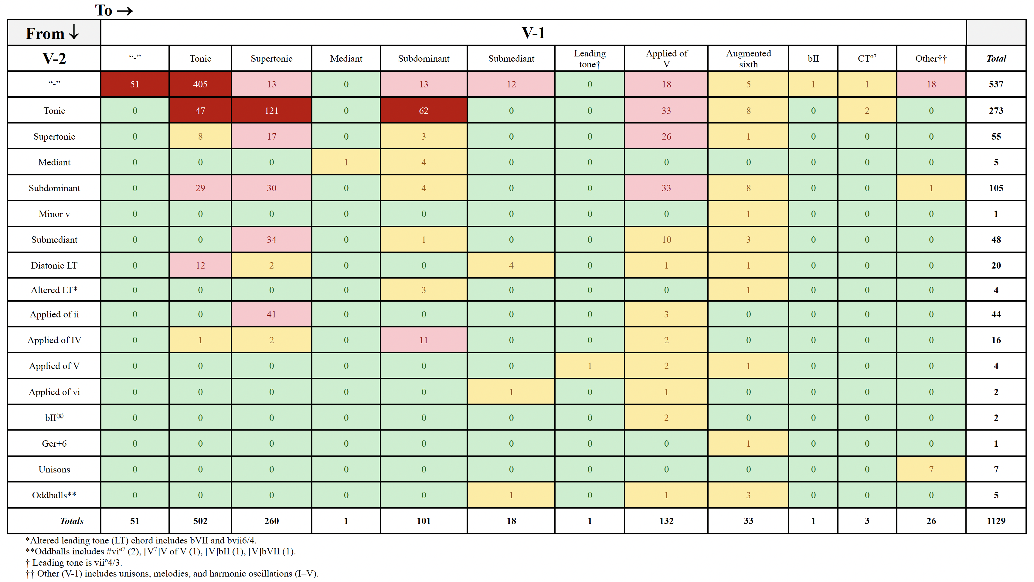 Example 10. (A) Heatmap illustrating the frequency of transitions from the chord occurring two chords before V (“V-2” on the y-axis) to one chord before V (“V-1” on the x-axis) in the dataset. (B) Heatmap illustrating the frequency of transitions at cadences from V-2 (y-axis) to V-1 (x-axis) in the dataset.