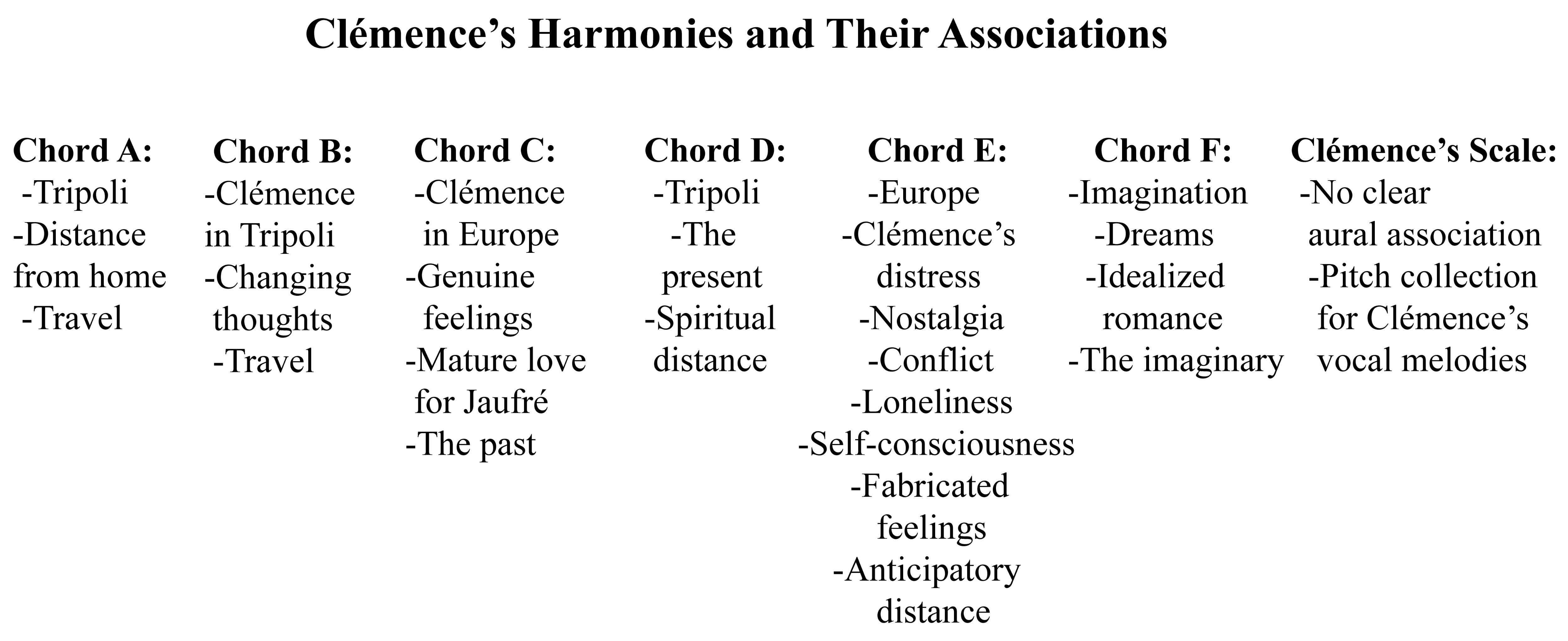Clémence’s six basic sonorities, with various associations projected during the opera