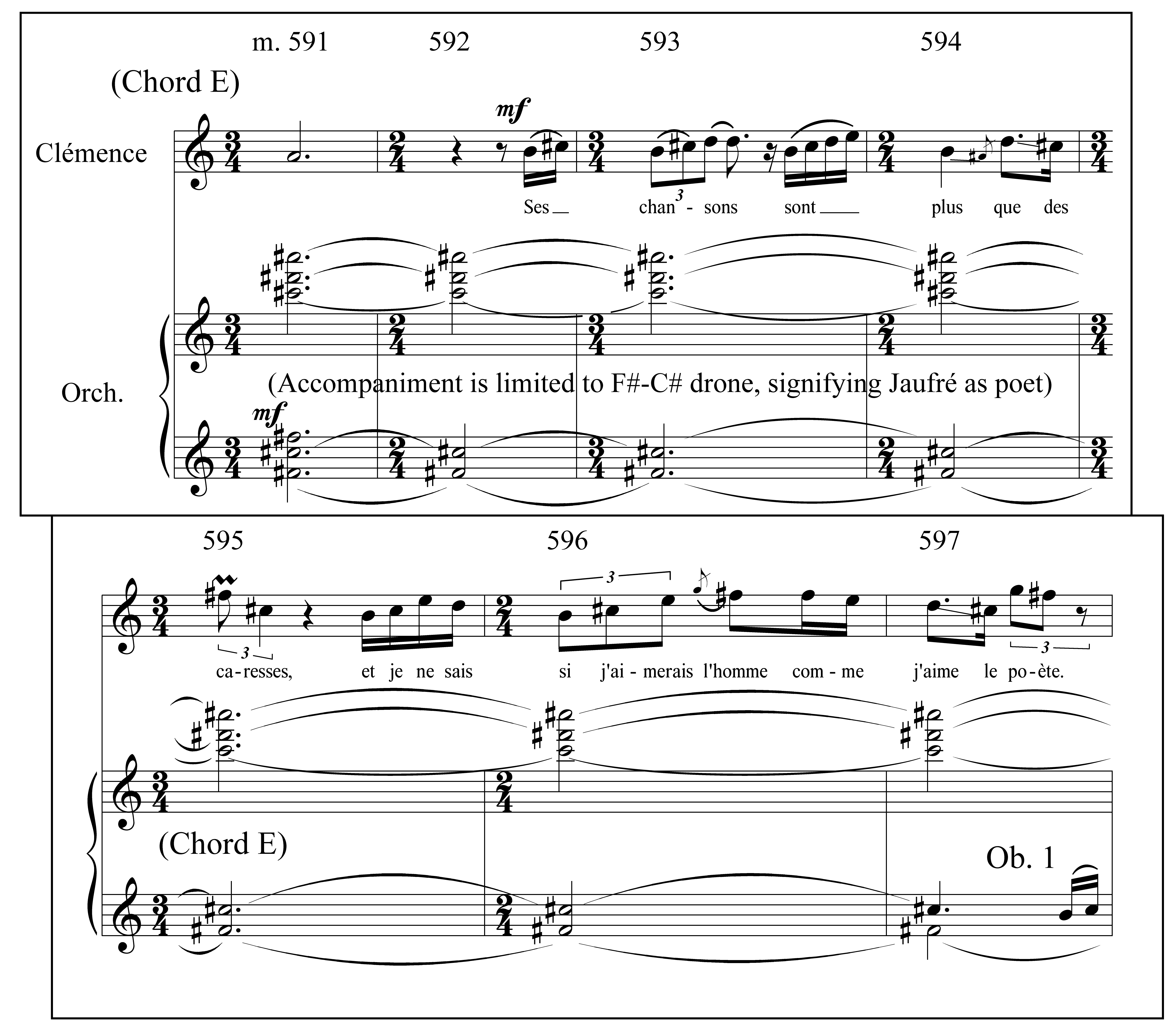 Example 15. Saariaho, L’Amour de loin, Act 3, mm. 591–600, showing the Rudel quotation in m. 598 after Clémence sings “His songs are more than hugs, and I don’t know if I would love the man like I love the poet.”