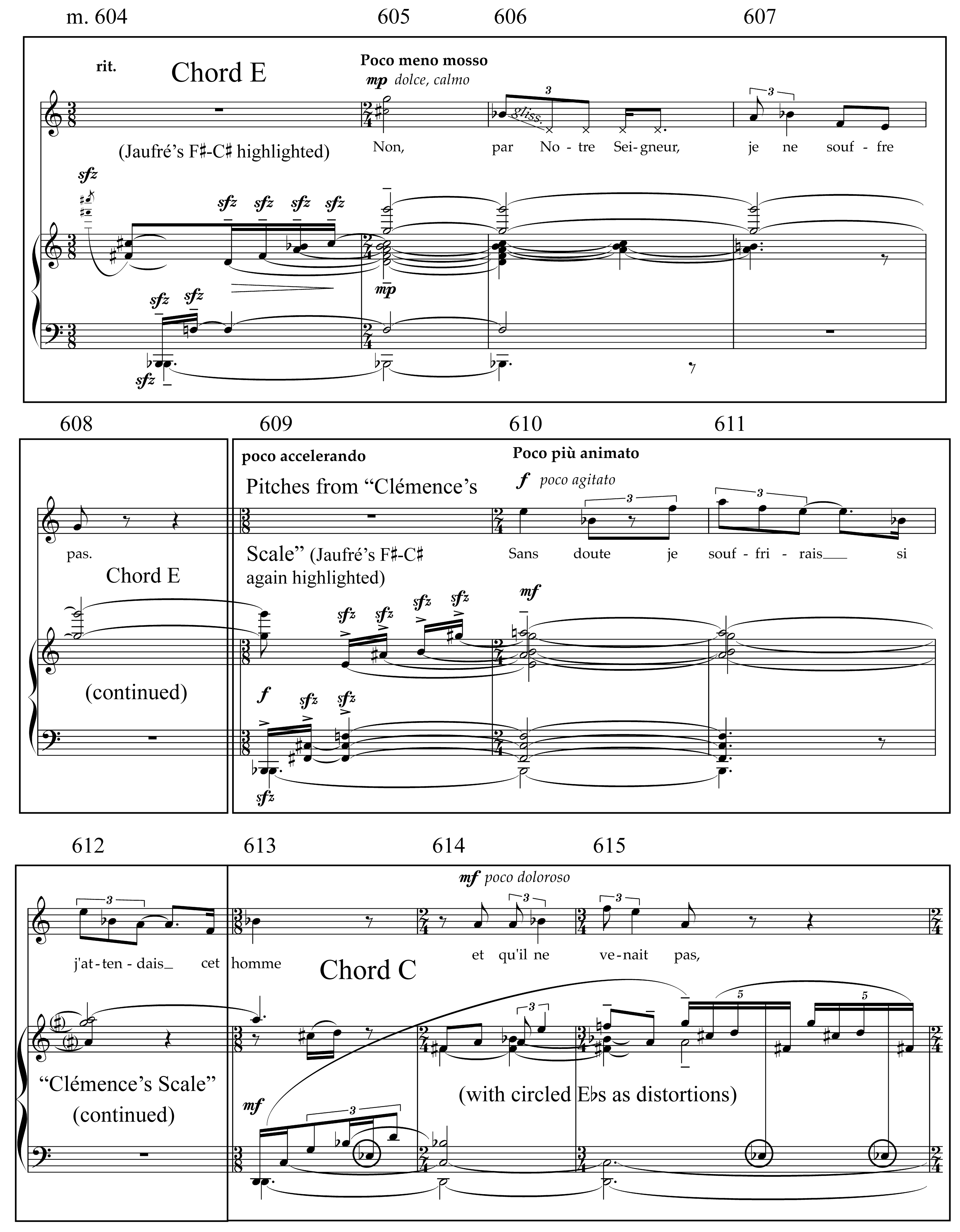 Example 16. Saariaho, L’Amour de loin, Act 3, mm. 604–38, demonstrating the presence of the distorted C and E chords