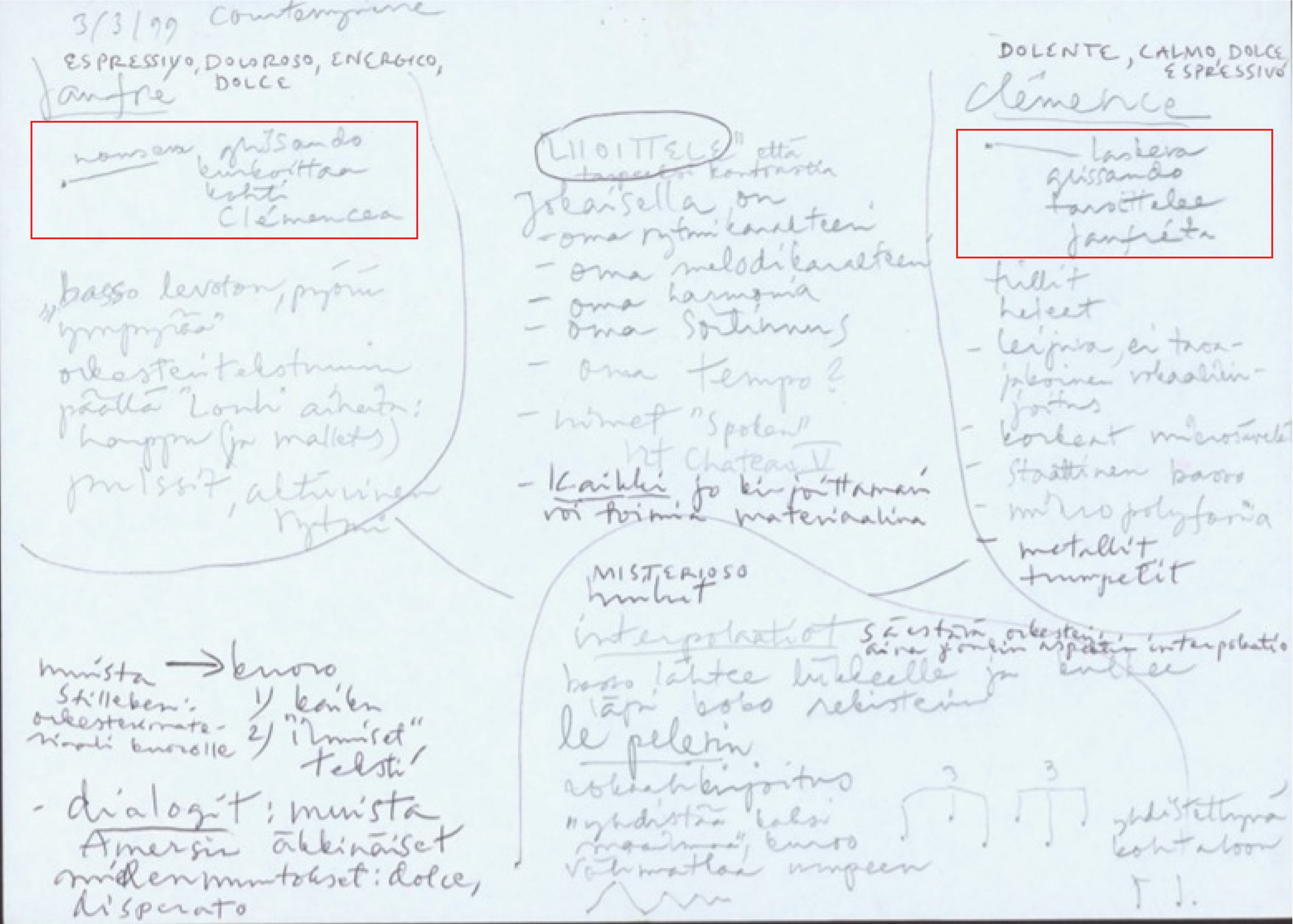 Example 18. Saariaho’s page of musical characteristics associated with Jaufré, Clémence, and the Pilgrim. Under “Jaufré” on the left, one can see that Saariaho has drawn an ascending line with the word “glissando” next to it; under “Clémence” on the right, she has drawn a descending line, again with the word “glissando.” Original manuscript from Kaija Saariaho Collection, Paul Sacher Foundation, Basel; first published in Calico 2019, reproduced by permission of the Paul Sacher Foundation.