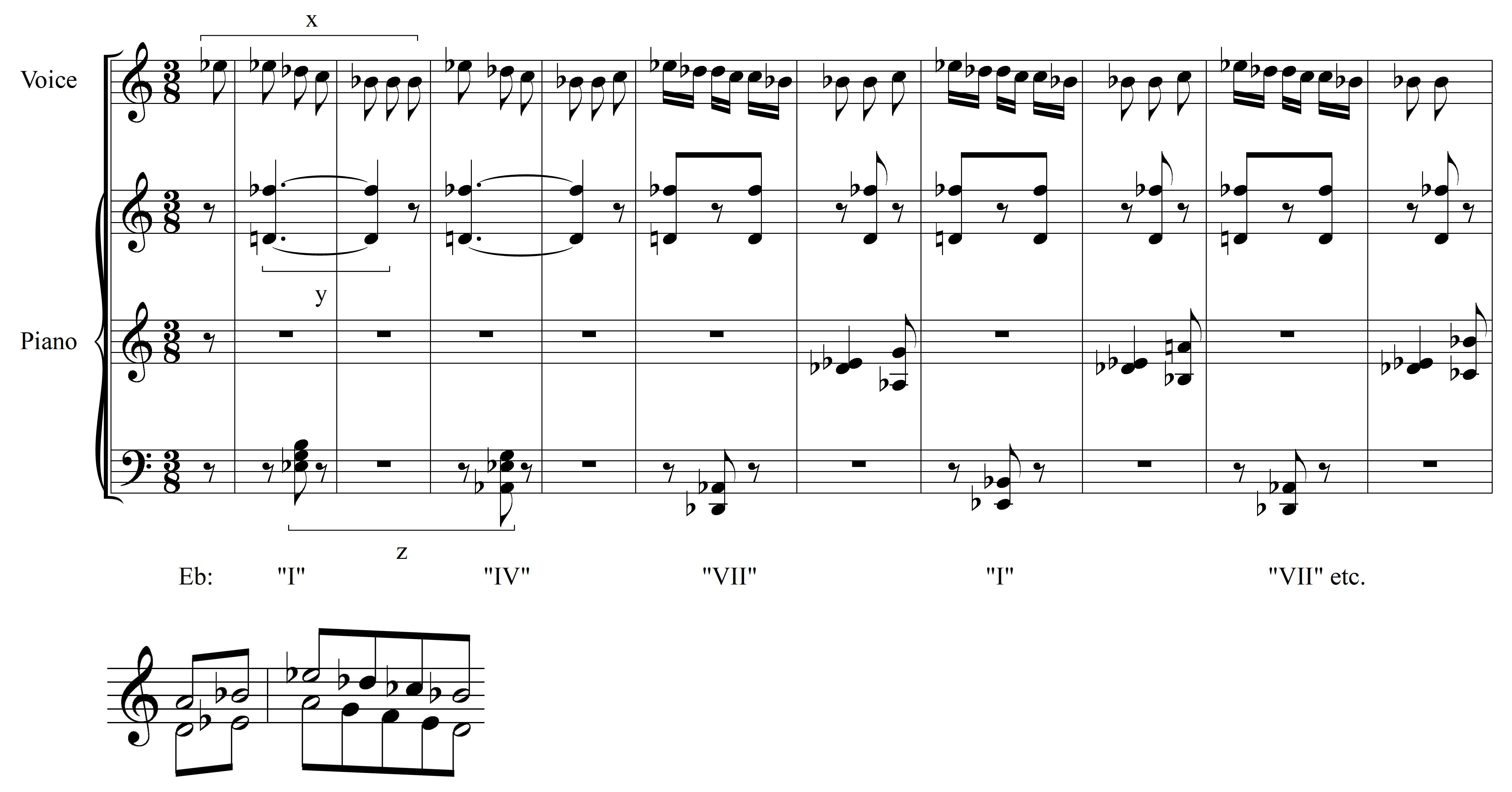 Example 2. Stravinsky, Pribaoutki, measures 1–10; Straus’s analysis—bi-quintal structure and three layers